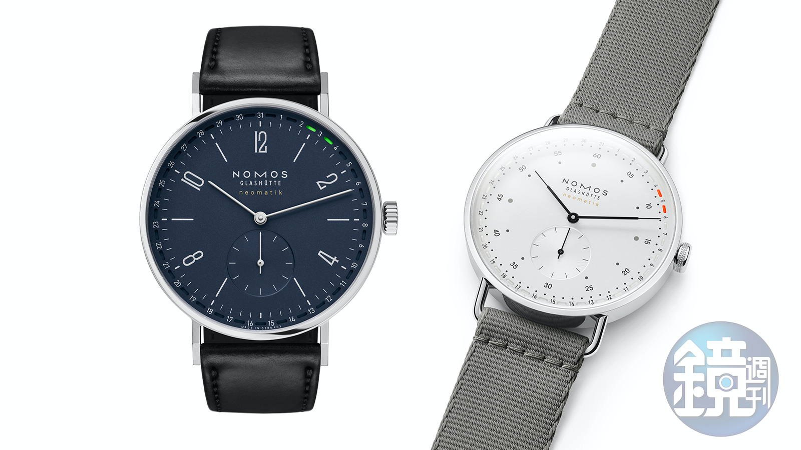 Club Campus在NOMOS產品的定位裡,是給大學畢業生的禮物,因此在價位上也比較入門,而且實心底蓋上可以刻字也是針對畢業禮物所做的設定。今年Club Campus推出灰色和橘色兩種顏色,搭配38.5mm和36mm的錶徑,基本上兩款只在於尺寸的差異,但灰面的時標和分鐘數字刻度的顏色使用其實不一樣。38.5mm的版本時標是紫色邊框搭上淺藍色分鐘標示、而36mm的時標框線和分鐘數字則以橘色呈現,在細微處以配色做出差異。