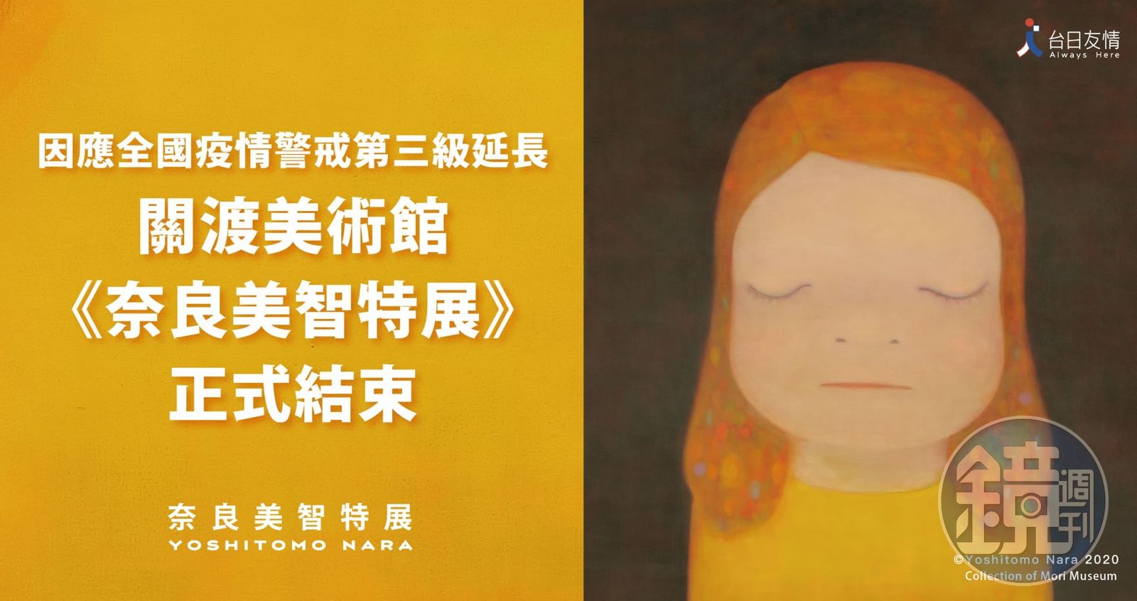 中華文化總會於臉書公告,因應全國疫情警戒第三級延長至6月28日,相關防疫措施持續執行,因此關渡美術館《奈良美智特展》即日正式結束。