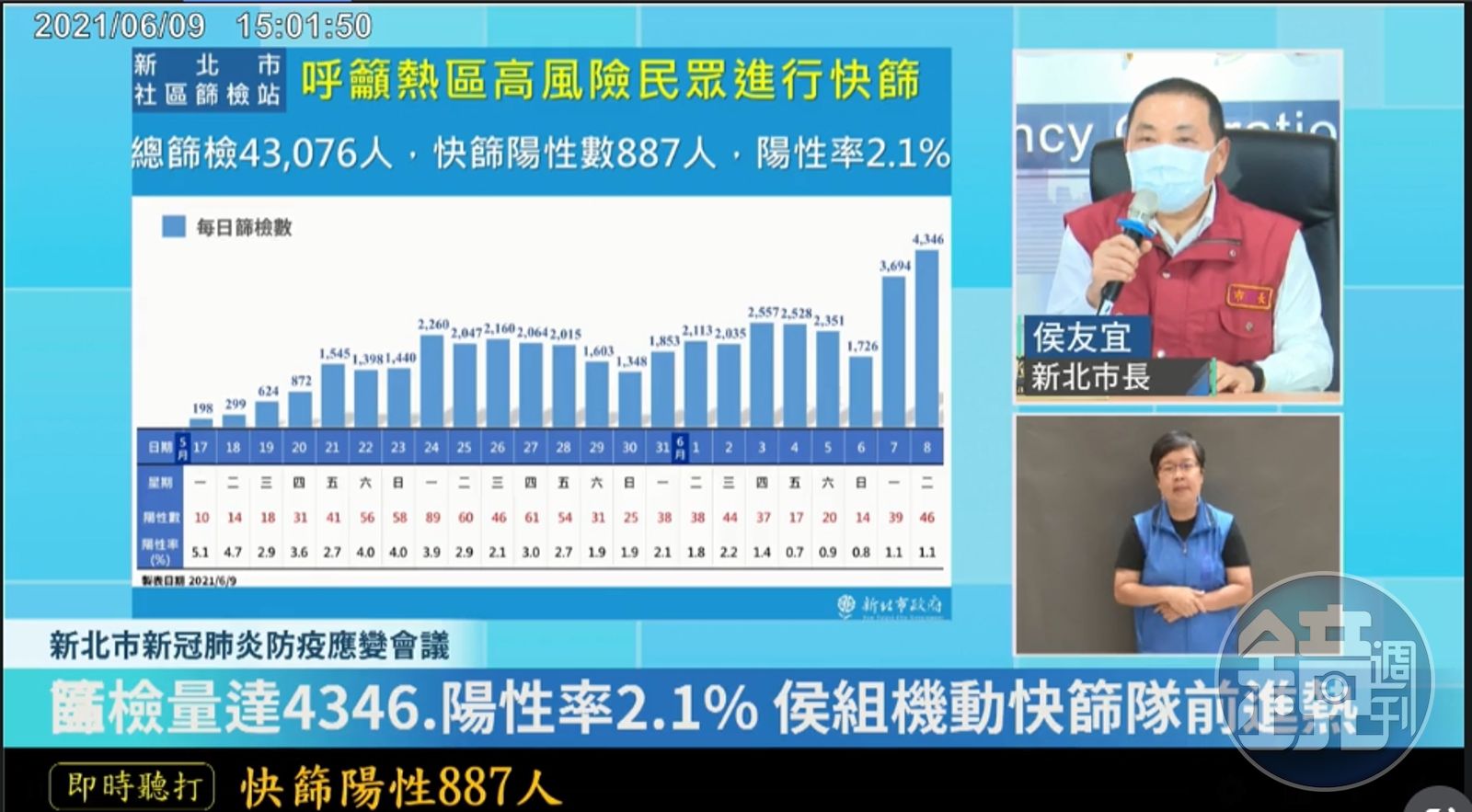 新北市長侯友宜表示,昨天篩檢量達4,346人,並再度呼籲高風險區域民眾趕緊出來快篩。(翻攝自我的新北市臉書直播)發布時間:2021.06.09 16:17 臺北時間