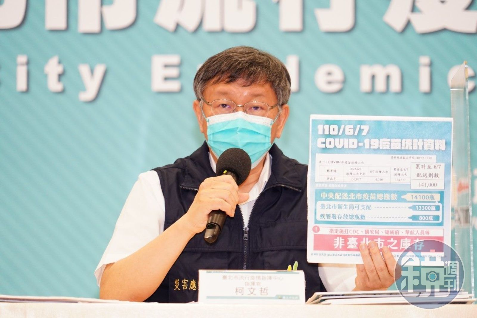 柯文哲指出,6月2日中央配發的疫苗可施打5萬4,000人,目前北市府已打了5萬7,909人。因為施打使用1cc的針頭,所以平均一罐可以施打10.7人。自今年3月至6月7日,北市獲得中央配送14萬1,000劑,目前已打13萬4,817人次。