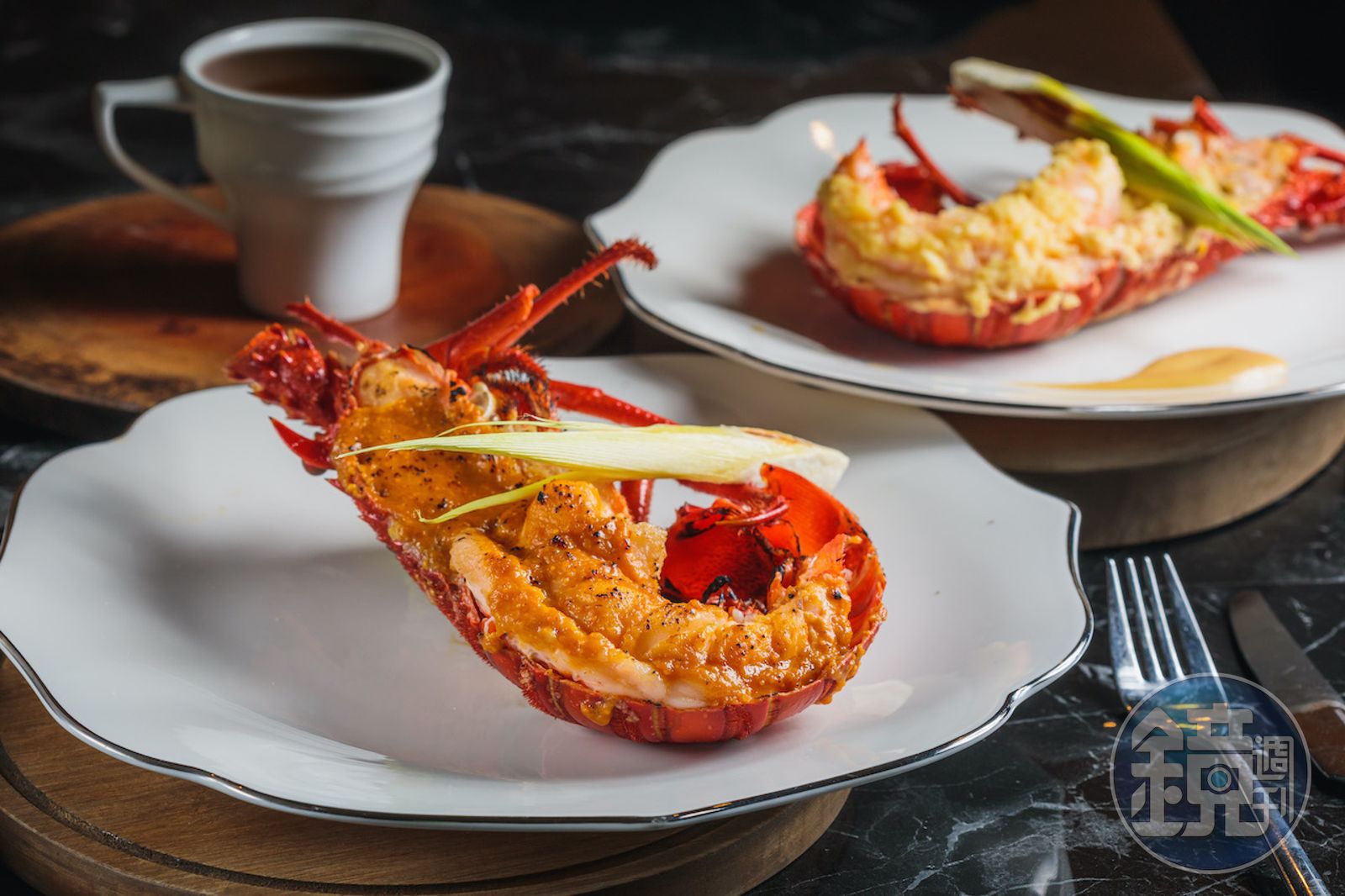 龍蝦2吃「澳洲玫瑰龍蝦佐蝦膏」(前)膏厚濃郁;「澳洲玫瑰龍蝦佐白酒檸檬酸味醬汁」(後)風味柔滑微酸。主廚曾懷永(阿興師)擅長為海鮮調配多款醬汁。(2,400元/隻)煎檯上香煎的龍蝦,全憑主廚經驗判斷何時才是最佳口感。「興鐵板燒」規劃6間包廂,聚餐享有隱密。用攝氏250度高溫煎烤的「澳洲玫瑰龍蝦佐白酒檸檬酸味醬汁」,從鐵板上一秒直送盤間,龍蝦熱騰騰地還冒著煙,入口時滴落湯汁,熟度正好。「香煎紅喉魚」可整尾煎得恰恰,也能剔骨做成魚排搭配松露燉飯,這樣一週來好幾次的鐵粉客人,每次都能吃到有新意的魚類料理。