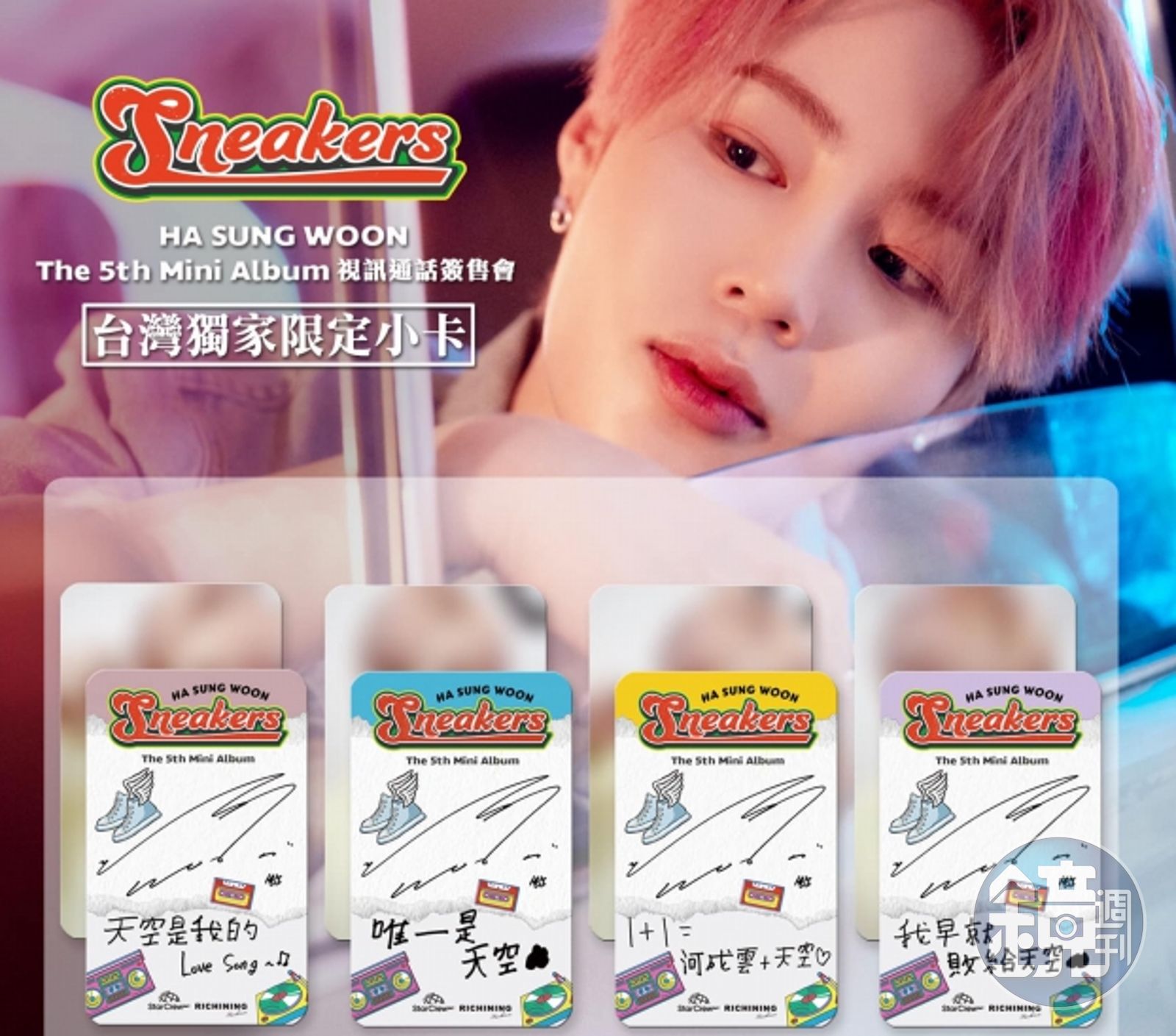 《HA SUNG WOON 5th MINI ALBUM [Sneakers]視訊通話簽售會》,參與產品預購的消費者除了能參加「視訊簽售」「親筆簽名專輯」「藝人親簽拍立得」等抽獎活動,台灣主辦單位更祭出「台灣限定手繪明信片」(2款買1張專輯送1款)以及「台灣限定小卡4款」(買1張專輯送1款),他在4款小卡各寫下不同情話,預購將於今天(14日)晚間11點59分截止,相關詳情可洽主辦單位RICHINING官方臉書專頁。