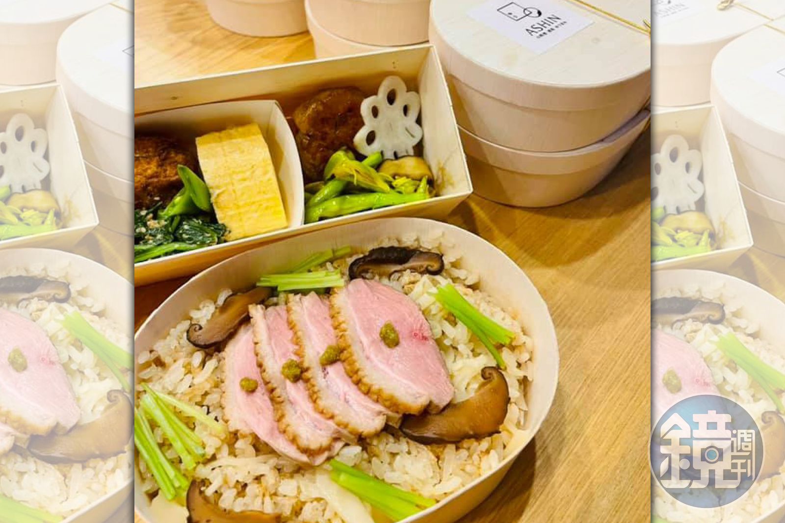考量醫護人員很忙,不可能領到便當馬上開吃,「所以我做的是可以在室內放4小時的日式冷便當。」便當把飯、菜分成2個木盒盛裝,一盒是用昆布柴魚高湯煮的「竹筍炊飯」鋪上「櫻桃鴨肉柚子胡椒旨煮」;另一盒配菜有「雞肉丸」「野菜飛龍頭」「高湯蛋捲」「鹽炒金針花」「波菜涼拌胡麻」「紫地瓜蜜煮」「醋漬花蓮藕」及「花菇自本煮」;便當是選用較高成本的木盒裝著,而且一次得用掉2個。