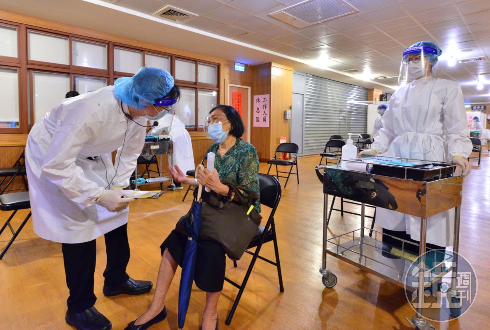 慈濟在新北市的五個靜思堂,除蘆洲靜思堂為中型接種站,其他新店、雙和、板橋、三重均為大型接種站,其中,以新店靜思堂為例,台北慈院安排4位醫師、4位護理師、8位行政人員,再加上慈濟志工的協助,從報到、問診一直到接種後的休息區,整體以減少長者移動為主,醫師問診、注射醫護人員移動,完成一位僅須約將近20秒,長者即可安住留觀,不須走動、移動坐位。