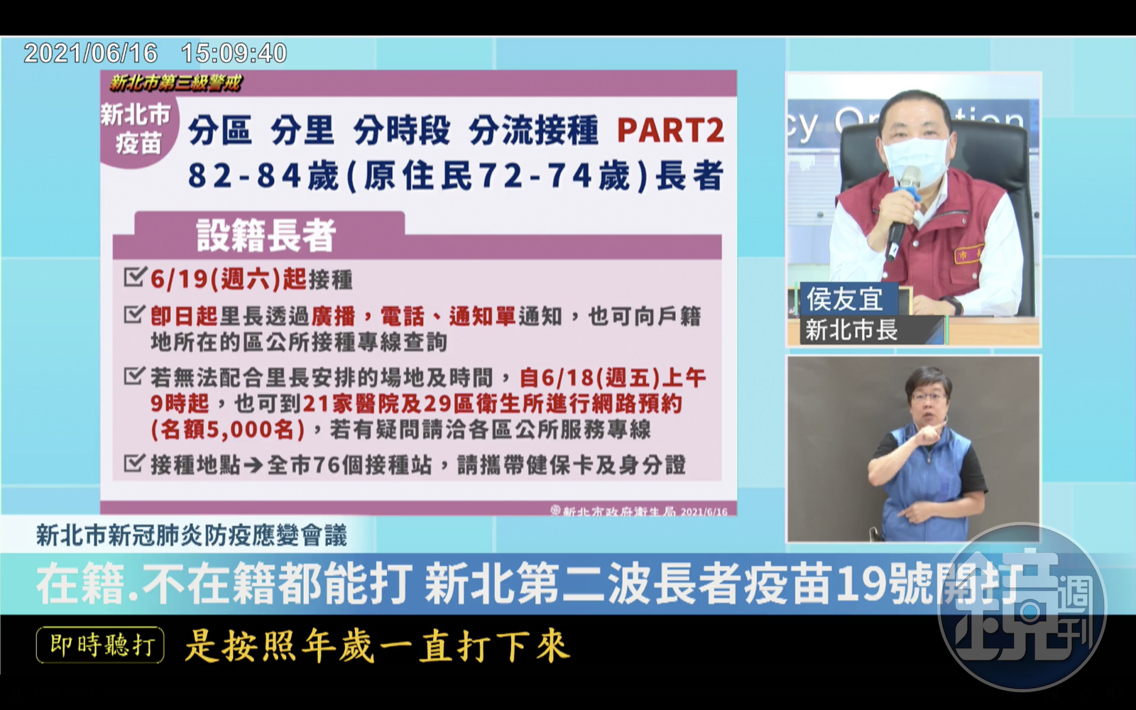 侯友宜進一步指出,長者部分以設籍優先,自19日起接種,即日起由里長透過廣播、電話、通知單通知接種時間,也能向戶籍所在地區公所接種專線洽詢,若無法配合里長安排的場地及時間,也有保留5,000名網路預約名額,可自18日上午9時起,至21家醫院、29區衛生所進行網路預約,預計在19日至20日中午12時期間接種;不在籍的長者則在20日下午起接種,可自18日起向里辦公室或區公所填寫意願調查表,或電話登記。