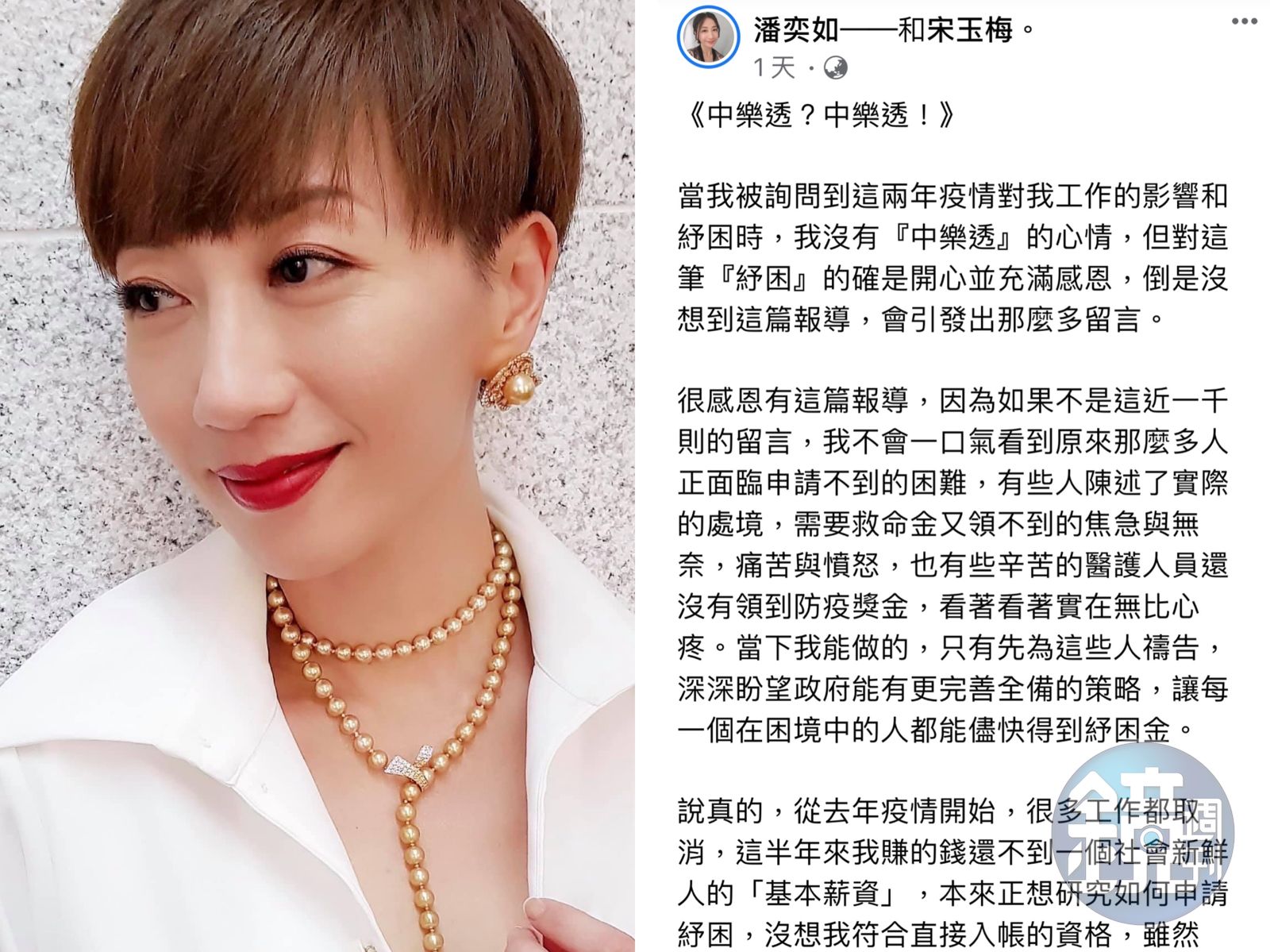 但話鋒一轉,潘奕如也擔心社會給予演藝人員「日入斗金」「高報酬」的標籤也讓她相當擔憂。她以表演工作者為例,不論知名還是不知名的演員,經常得面對有一餐沒一餐的困境,大部分的演員酬勞也沒外傳的如此豐厚。時不時還得面對「過氣」「被取代」的壓力,女星們還得面臨年華老去後,外表被抨擊的殘忍打擊,更有不少藝人因為網路霸凌而走上不歸路。疫情當下每個行業都不容易,潘奕如只希望大家能共同面對困境,一起挺過這場危機。