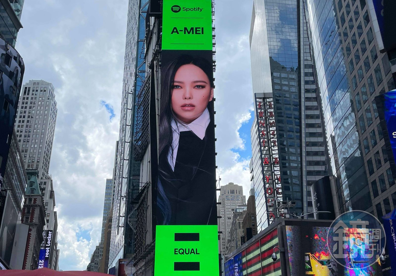 阿妹的身影出現在紐約曼哈頓區時代廣場(Times Square)上的巨型LED屏幕。(環球音樂提供)音樂串流平台Spotify為慶祝國際婦女節展開全新重點企劃EQUAL Global Music Program,因此,邀請aMEI擔任代表,跟全球34位女歌手共同傳遞女性音樂人的聲音。