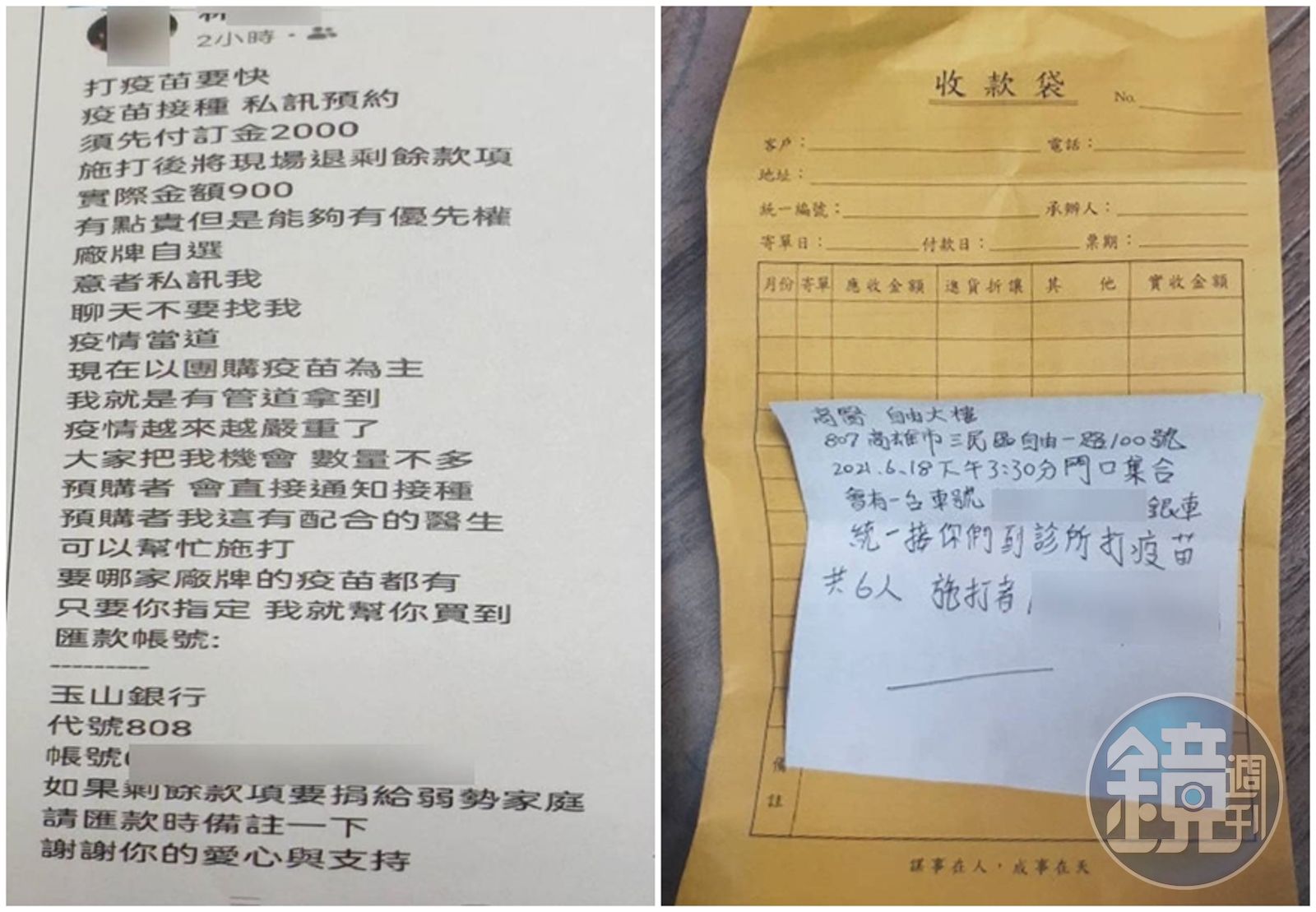 一名教授見臉書有人貼文,對方宣稱,自己手上有多款疫苗,除了多數人接種的AZ、一針難求的莫德納,甚至連台灣沒有進口,必需冷鏈技術保存的輝瑞、嬌生,他手上都有現貨,想打的人,只要花2千元,就可以在他安排下,到醫院讓特定醫師注射。