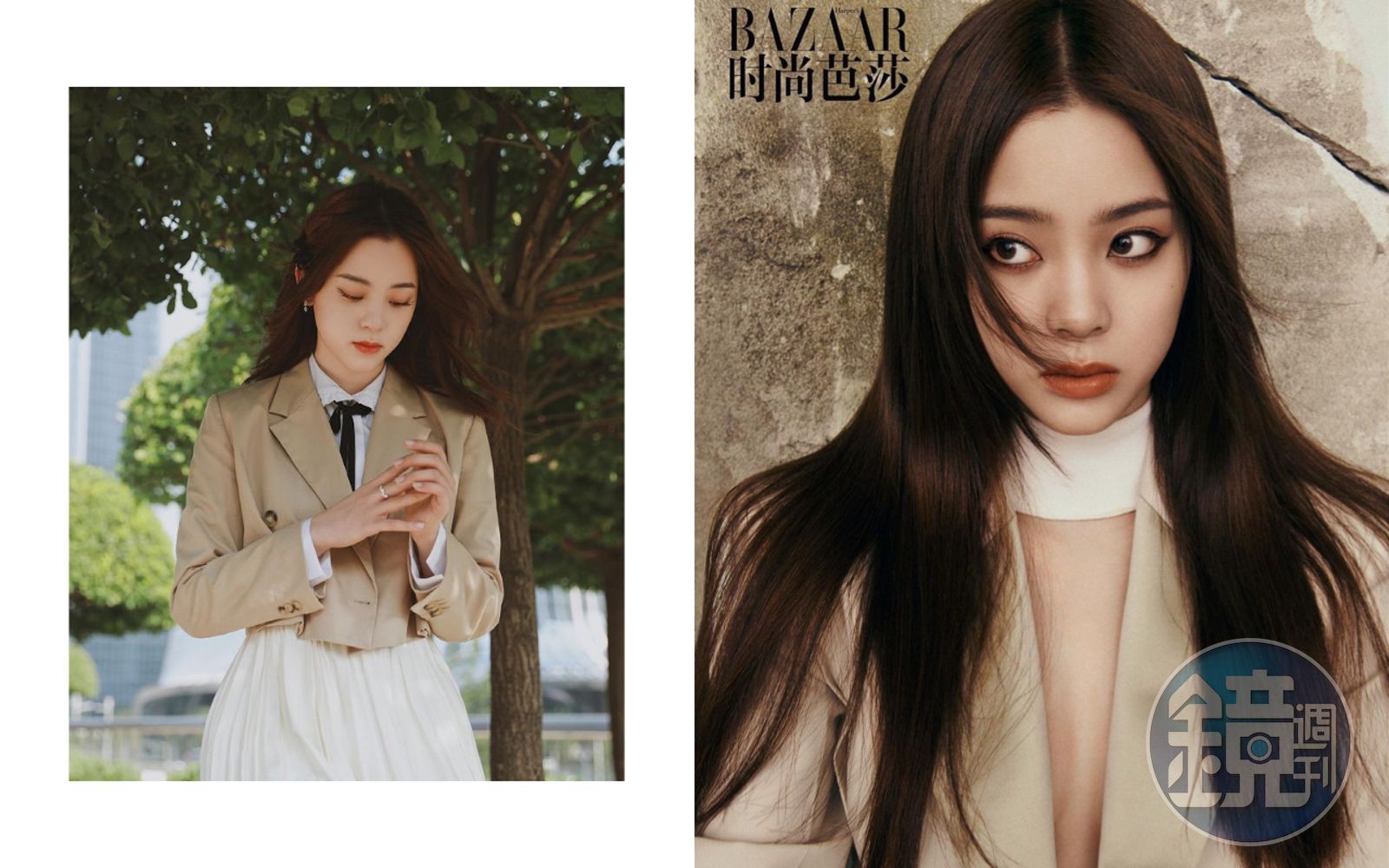 歐陽娜娜拍攝中國版《哈潑時尚》電子刊封面,一襲Givenchy奶茶色西裝讓她「美奶姿」全都露。(翻攝自歐陽娜娜IG)歐陽娜娜一口氣接下了精品名牌Givenchy與高跟鞋之王Roger Vivier的代言,這個成就實屬難得。她分享了拍攝中國版《哈潑時尚》(又稱《時尚芭莎》)的電子刊封面,其中的一套,她穿上了Givenchy奶茶色西裝,胸前完全敞開,心、胸「好心肝」部分全都露,可說是尺度大開,讓人看了臉紅心跳。