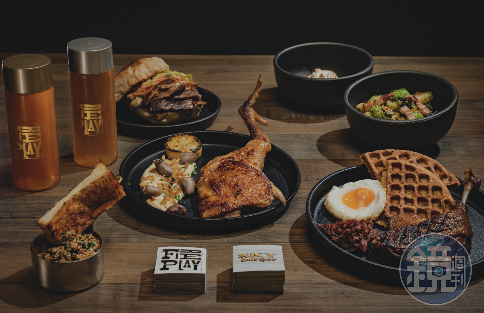 這次的肉品是Sky先處理過後,再由Nick做最後的火烤、組裝。搭配鬆餅與太陽蛋的「櫻桃木煙燻油封櫻桃鴨腿」,是以多種香料醃漬的花蓮玉里櫻桃鴨腿,經過櫻桃木煙燻後,再以自製的鴨油油封。這次的漢堡麵包由「慶祝烘焙」(原野上麵包天母店)提供,搭配Sky以波本威士忌橡木桶燻烤12小時的豬肉,「燻烤馬告手撕豬肉」有來自威士忌橡木煙燻木片獨有的麥芽糖香、椰子、香草和太妃糖香氣,賦予豬肉獨特風味,加入馬告提味,多了辛香、檸檬的氣息。