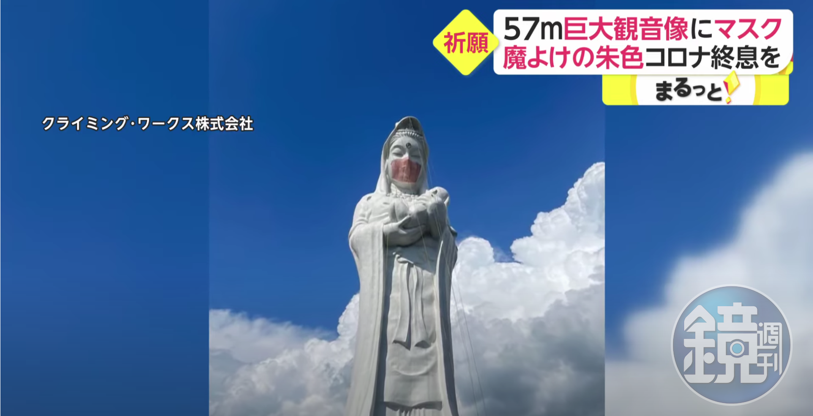 據外媒綜合報導,今年2月,這座巨型慈母觀音像因地震發生龜裂,於本月16日進行修復工程時,當地的「法國寺會津別院」特別指示,希望能替觀音像戴上「象徵疫情退散的口罩」,祈求疫情早日結束。