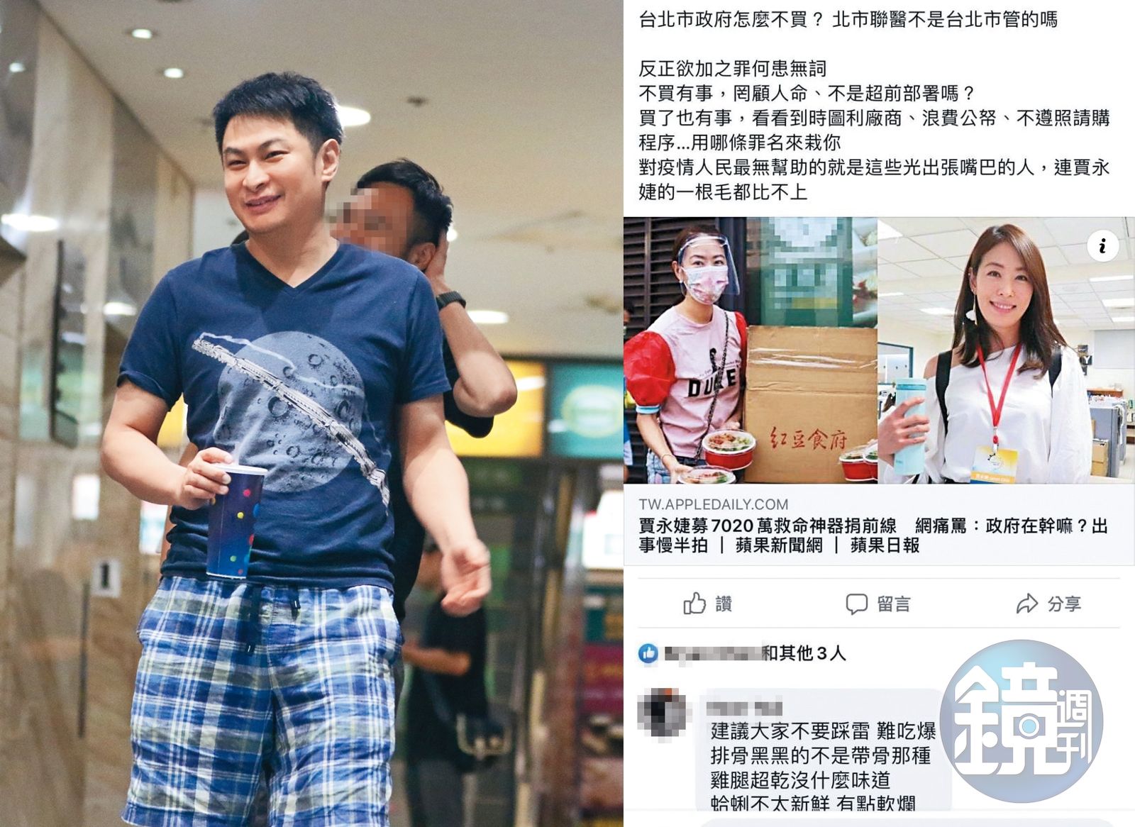 尤其林帛亨友人轉發的新聞,縮圖放賈永婕去醫療前線發便當的照片,有朋友不滿在貼文下面留言罵道:「難吃爆,排骨黑黑的不是帶骨那種,雞腿超乾沒什麼味道,蛤蜊不太新鮮,有點軟爛」結果讓無辜的賈永婕躺著也隔空中槍。