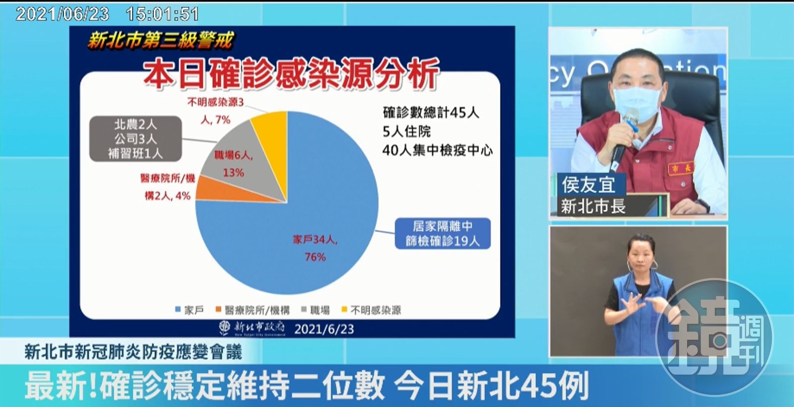 侯友宜表示,45例中,家戶感染有34人,佔76%;其中居家隔離中篩檢確診有19人,都在掌控中,因此並無形成傳播鏈。至於剩下26人要特別注意,其中仍多是家戶感染,醫療院所2人、不明感染源3人,以及職場染疫6人;其中北農佔2人、公司3人、補習班1人。