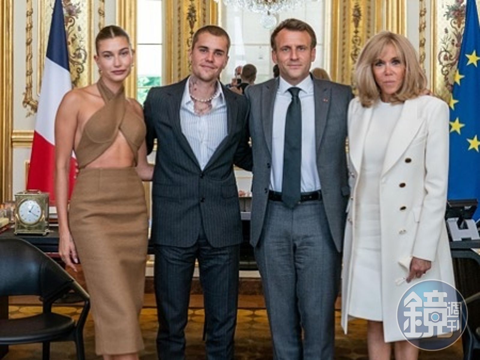 小賈斯汀(左2)與老婆海莉(左1)日前與法國總統馬克宏(右2)夫婦會面,兩對夫妻的服裝畫風差很大。(翻攝自Justin Bieber IG)發布時間:2021.06.23 11:15 臺北時間