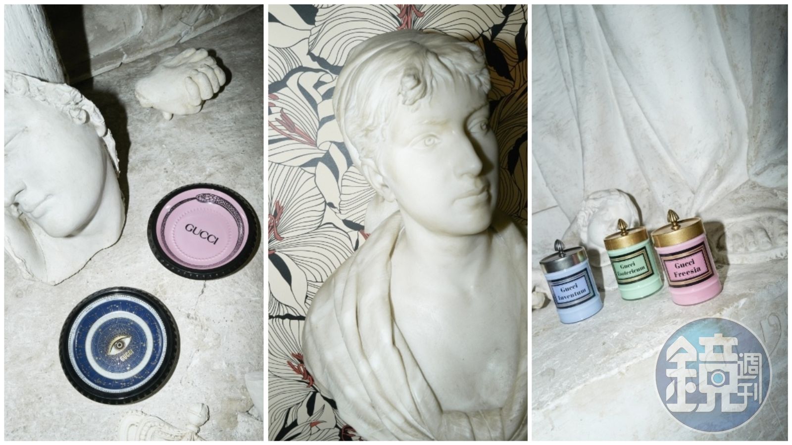 Gucci Décor家飾系列由品牌創意總監Alessandro Michele操刀設計,此系列中3款全新包裝的香氛蠟燭,靈感源於19世紀晚期西藥房中的收納罐,3種顏色分別代表不同香型。復古鍍銀餐具握柄上的獅子頭像呼應常見於Gucci 珠寶中的經典元素,獅頭背面則提供預先訂製名字縮寫的客製化服務。