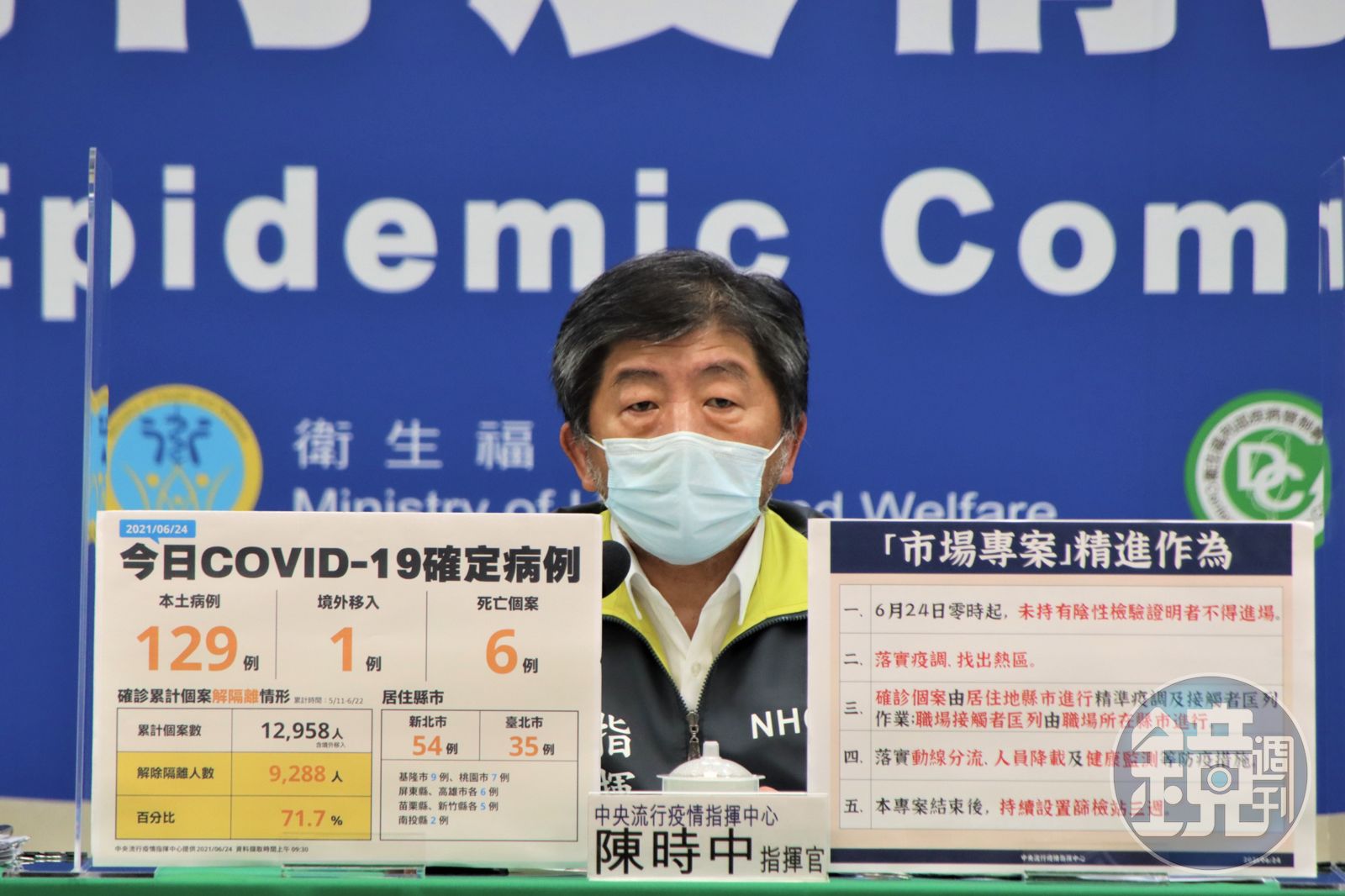 指揮中心昨(23日)晚間與農委會、雙北市政府及雙北農產/果菜運銷公司進行專業溝通,並討論市場專案各項細節;陳時中今日於疫情記者會表示,與台北市長柯文哲討論後續處置方式,發現確診個案有些疫調無法做的很完全,未來會落實疫調,同時也進一步說明相關內容,包含未持有陰性證明者不得進入市場、職場接觸者匡列由職場所在縣市進行疫調、專案結束後持續設置篩檢站三週。