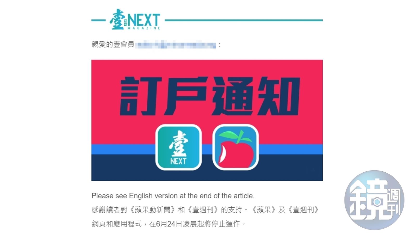 《壹傳媒》於23日晚間向訂閱用戶寄出E-Mail,內容提及《蘋果》和《壹週刊》全部訂閱計劃即起停止自動續訂,也不會收取下期費用,目前正諮詢法律意見,若有消息會再行通知,並感謝所有讀者、訂戶、廣告商,以及香港人民一直以來的厚愛和支持,「在此別過,珍重。」