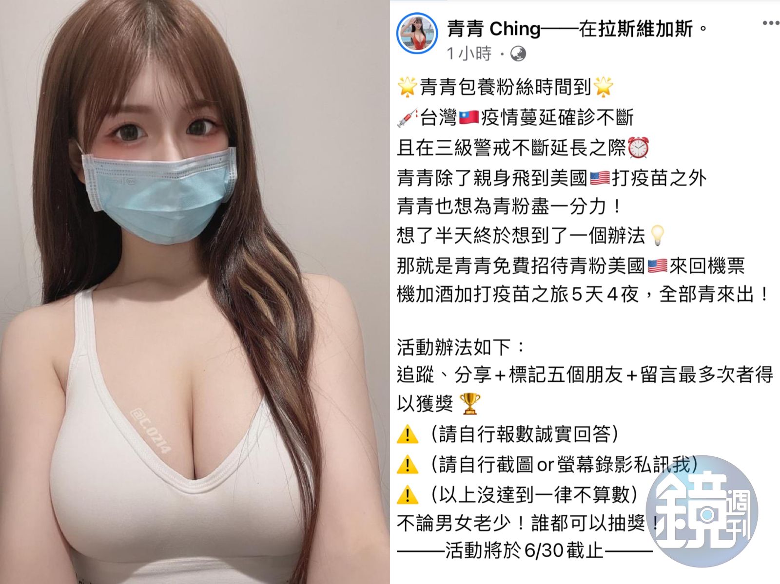 目前台灣急缺疫苗,不少人飛到對岸或砸重金到美國施打免費疫苗,本身由美國管轄的關島政府也抓緊商機,決定開放外國人到關島施打疫苗兼旅遊,台灣不少旅遊業者蠢蠢欲動,在美施打疫苗效果不錯的青青成了不錯的業配宣傳代表囉!不過還是有網民不忘舊事重提,「聽說去要簽本票」,酸味十足。可惜不是青青親自帶團,否則肯定真會有不少宅男趨之若鶩。