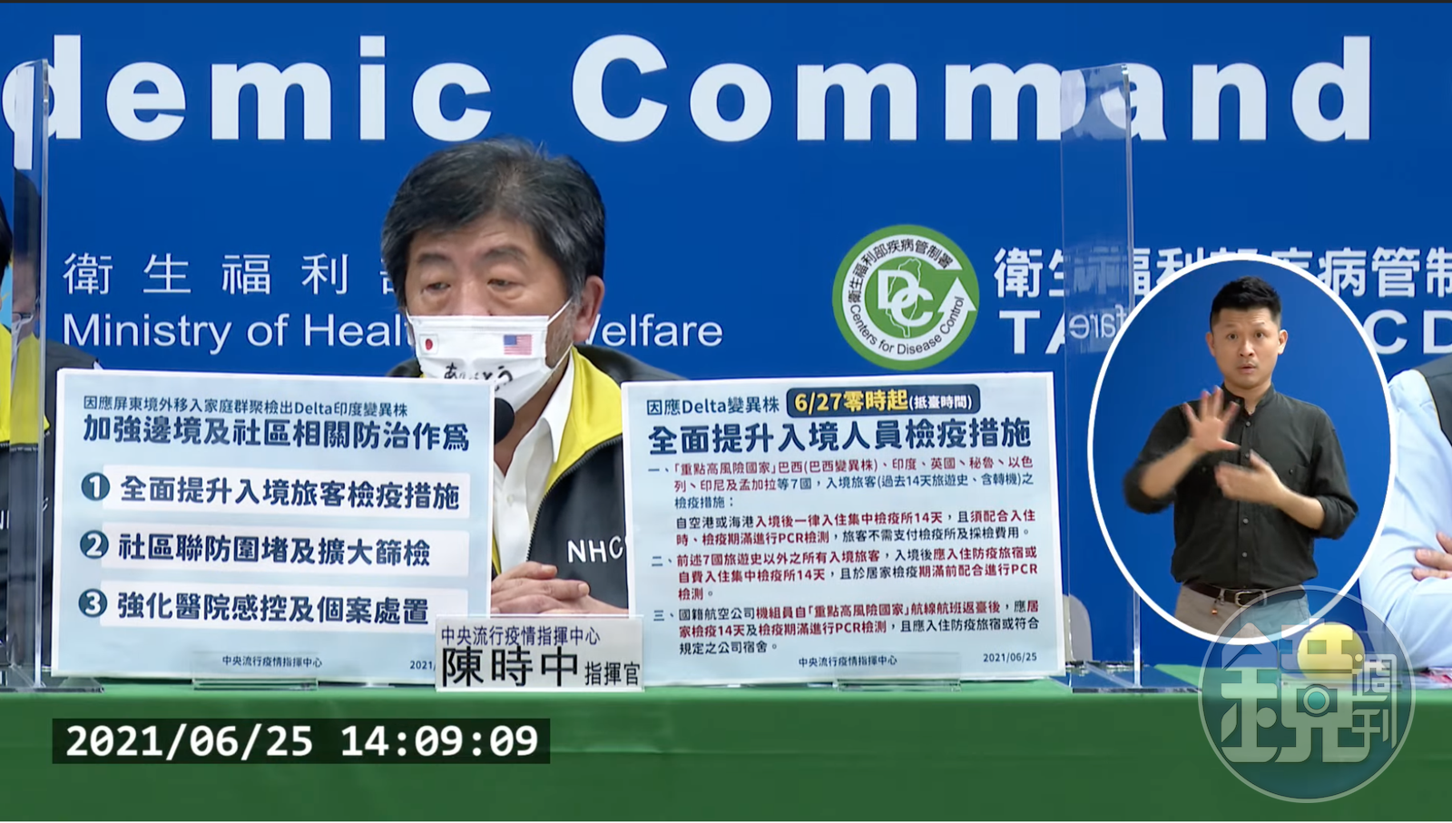 陳時中指出,自秘魯入境的確診祖孫經基因定序後,認定是印度變異株(Delta變異株),以前有5例印度變異株,這次變異株中無法確定其餘相關染疫是否為同樣變異株,也許是不同感染源,但目前在釐清中;因應印度變異株較英國變異株(Alpha變異株)傳播例高4至6成,國內亦出現自秘魯境外移入個案檢出印度變異株,其鄰近的孟加拉、印尼等國該變異株佔比近期亦呈增加趨勢,指揮中心全面提升入境人員3項檢疫措施。