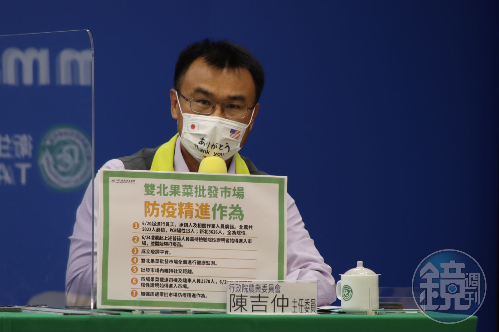 陳吉仲指出,經指揮中心討論就雙北兩市果菜批發市場提出7項防疫精進作為,包含北農第一市場(萬華)、第二市場(濱江)、新北市三重及板橋,雙邊共同防疫是因為承銷人會在兩處往來。因此20日起針對員工、承銷人與相關作業人員廣篩,台北市的北農共篩檢5,022人,15人PCR陽性,但並非原先造冊人員而是零批市場人員,新北則篩檢3,626人皆為陰性。
