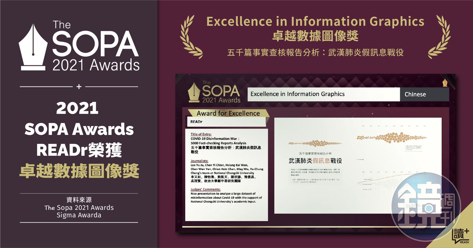 SOPA 評審在評語中肯定此專題在學術團隊的支援下,分析了 COVID-19 龐大的不實訊息資料集,並以透過資料視覺化的方式良好的呈現。而這也是 READr 第四度入圍,並繼 2018 年〈一起回家:原住民傳統領域在吵什麼?〉、2019 年〈新二代的難題〉之後,再度獲得 SOPA 肯定。