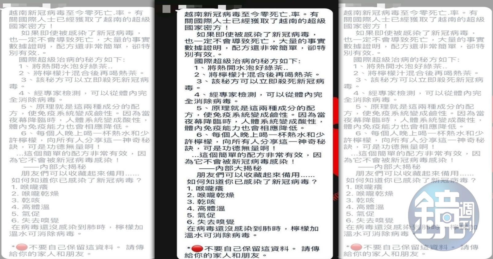 台東縣關山分局日前接獲檢舉,指Line群組有人散布疫情假消息,該貼文聲稱:「越南新冠病毒至今零死亡率。有關國際人士已經獲取了越南的超級國家祕方!使用後,可以從體內完全消除病毒。向所有人分享這一神奇祕訣,可是功德無量啊......」,其內容更是荒謬,竟然告訴民眾,熱開水泡綠茶,加檸檬汁喝,即可殺死新冠病毒。