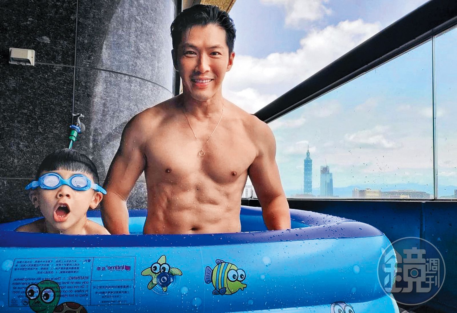 黃少祺(右)在陽台搭了泳池陪小孩,想不到爸爸這一「乳滑」搶盡「峰」頭。(華人創作提供)發布時間:2021.07.04 05:58 臺北時間