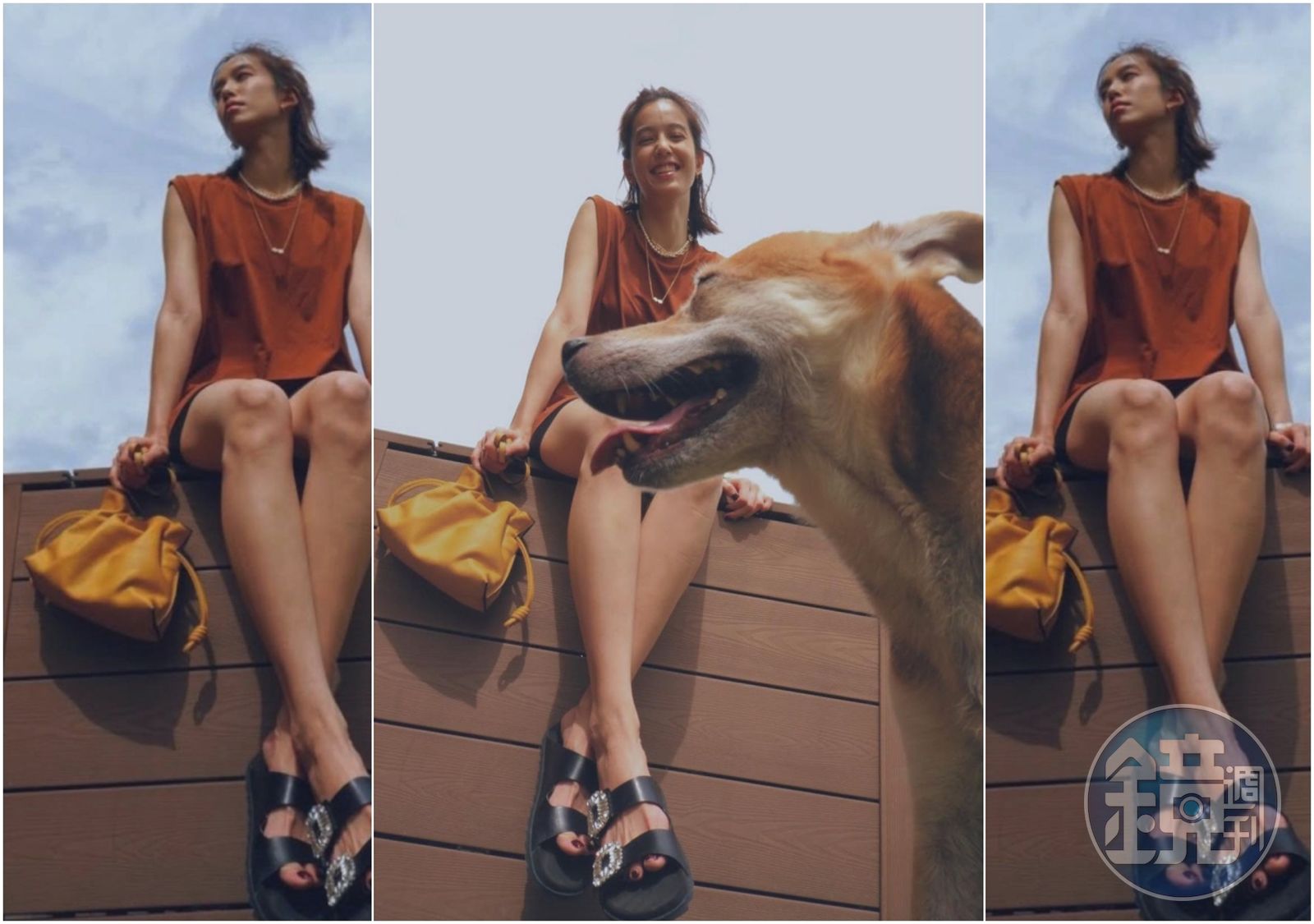 悶在家裡接受三級警戒實在令人發慌,藝人們都如何打發居家時光呢?陳庭妮在炎炎夏日的午後,挖起睡覺的愛犬到自家頂樓曬太陽玩自拍,她手上的LOEWE Flamenco暖沙色包款與無袖上衣顏色相襯而協調,不過最搶鏡的莫過於吐舌愛犬的亂入,時尚居家氛圍的營造,其實不就是這樣自然而日常嗎?