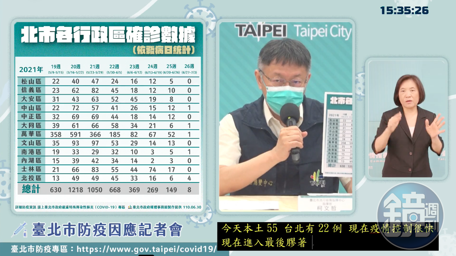 柯文哲今表示,北市疫情一開始控制很快,不過後來陷入膠著,現在北農是以「專案」方案處理,其他行政區則按照原本計畫清零,大家需要有一點耐心。柯文哲也稱,北市居家隔離人數在千人左右以維持幾天,快篩陽性數也算是降得很快,不過近來稍微趨緩,對此市府統計了一下,發現最近70%是家戶感染,因此也呼籲民眾在家吃飯的時候儘量不要一起吃,把時間錯開,因為吃飯時聊天最危險。
