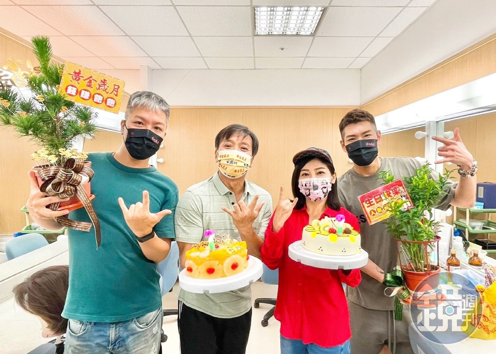 王彩樺(右二)、阿甘(左一)、小路(右一)帶盆栽跟蛋糕到休息室為王中平慶生。(民視提供)發布時間:2021.06.30 15:34 臺北時間