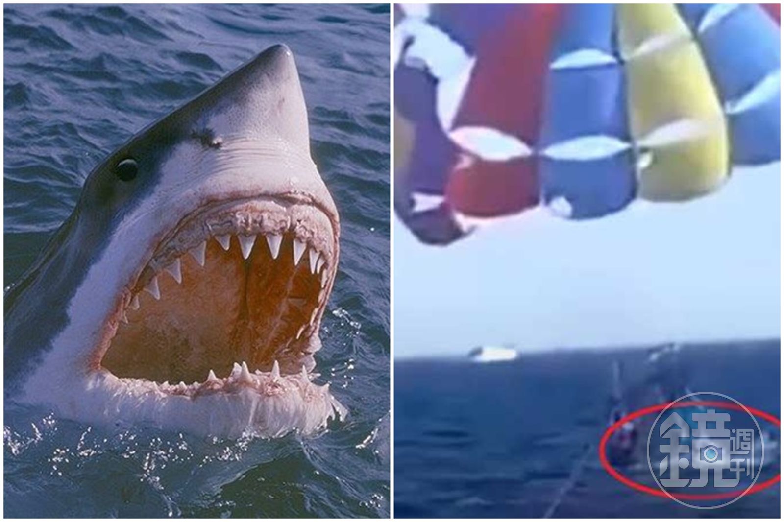 據英國《每日郵報》報導,這名37歲的男子在約旦南部亞喀巴灣(Gulf of Aqaba)水面上,背著傘具在海面上玩滑翔傘,當接近海面盤旋時,竟突如其來遭到一隻大鯊魚狠咬,該鯊魚似乎早將男子當成獵物,從海中躍起對準男子的腿部狠咬。