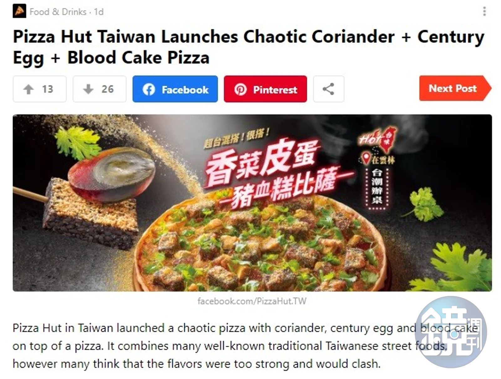 美國9GAG在文中表示,台灣必勝客推出了一款混合香菜、皮蛋和豬血糕的「混亂」(chaotic)披薩,直指它結合了台灣許多著名街頭小吃,但許多人認為這味道太強烈,可能會讓口味非常衝突。文章一出隨即引起大票外國網友討論,紛紛表示「它很好,只是別稱它為披薩」「必勝客想跟義大利宣戰嗎」,還有網友表示,這可能會讓黑手黨大人物(Mr. Big)對必勝客說「你不尊重我,你也不尊重我的祖母!」