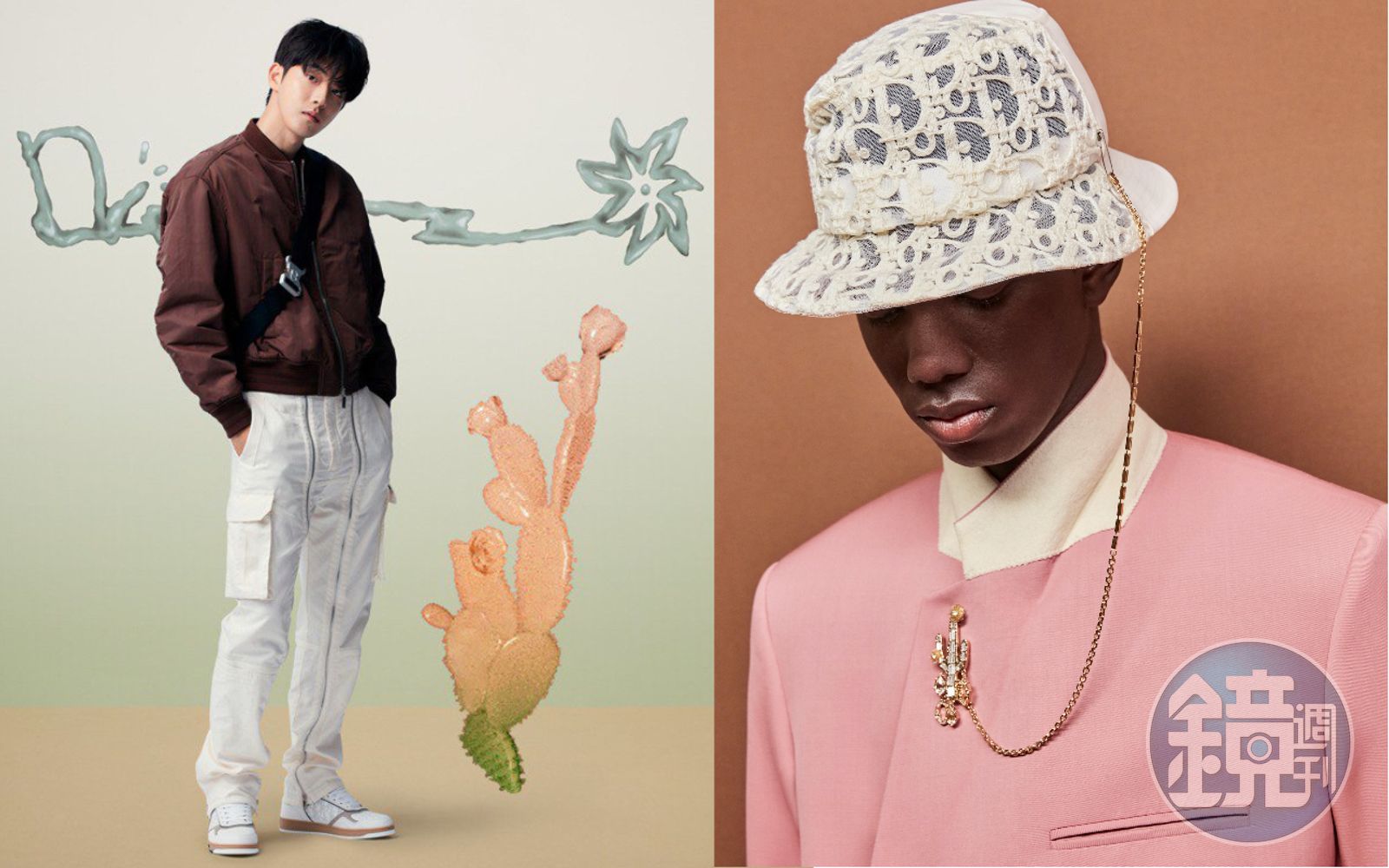 迪奧先生鍾情的大峽谷及沙漠景致色彩——天空粉紅、沙丘褐、風暴塵灰、奶油白、錦葵紫、開心果綠與澗水藍,成了本季男裝的主軸特色。深受凡爾賽宮皇室喜愛的田園風光「Toile de Jouy」印花,加入了仙人掌等沙漠圖騰,命名為「Toile de Cactus」。