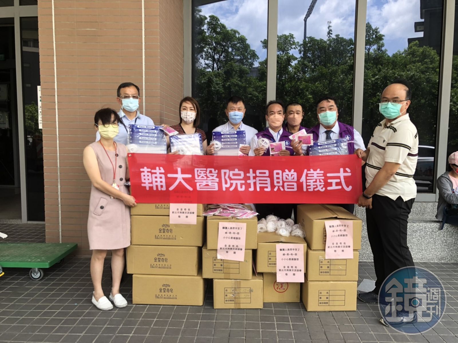 新北市議員劉美芳(後排左二)與商業協會、企業共同捐贈防護面罩、口罩和口罩支架上千個給輔大醫院。(劉美芳服務處提供)發布時間:2021.07.01 10:03 臺北時間