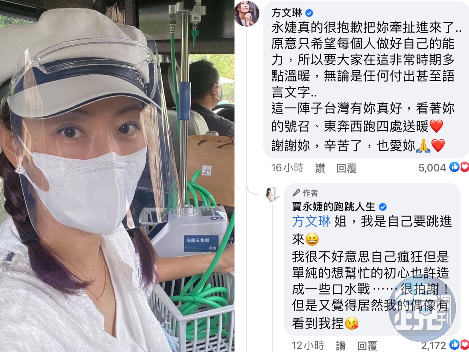為此賈永婕特地發了一篇文章安慰方文琳「文琳姐你是我的偶像,飛鷹時期我就在追你了,愛你。」並呼籲大家冷靜一點,彼此互相尊重、關心,「我們越團結力量越大,這樣病毒才會怕,嚇死病毒吧!」方文琳也跑到底下留言向賈永婕致歉「永婕真的很抱歉把妳牽扯進來了⋯」賈永婕則大方回應:「姐,我是自己要跳進來」。兩人互動引來網友一片好評。