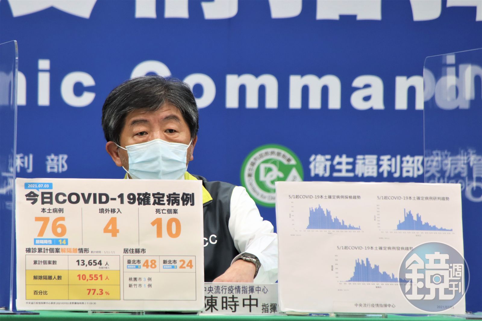 指揮中心表示,今日新增之76例本土病例(其中14例為居家隔離期間或期滿檢驗陽性者),為 31例男性、45例女性,年齡介於未滿5歲至70多歲,發病日介於今年6月22日至7月2日。個案分布以台北市48例最多,其次為新北市24例、桃園市3例,新竹市1例;其中55例為已知感染源、21例調查中,相關疫情調查持續進行中。