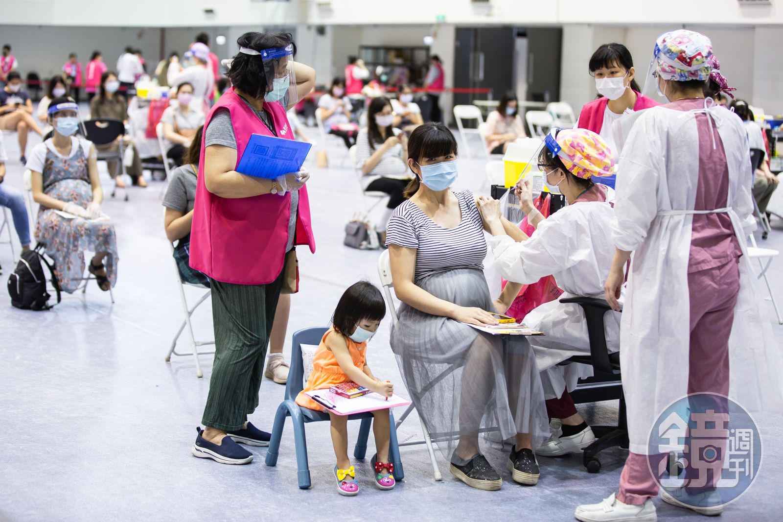 孕婦專屬接種疫苗現場也備有小椅供攜帶幼童的孕媽媽,小女孩在媽媽身旁邊畫圖邊等媽媽接種疫苗。