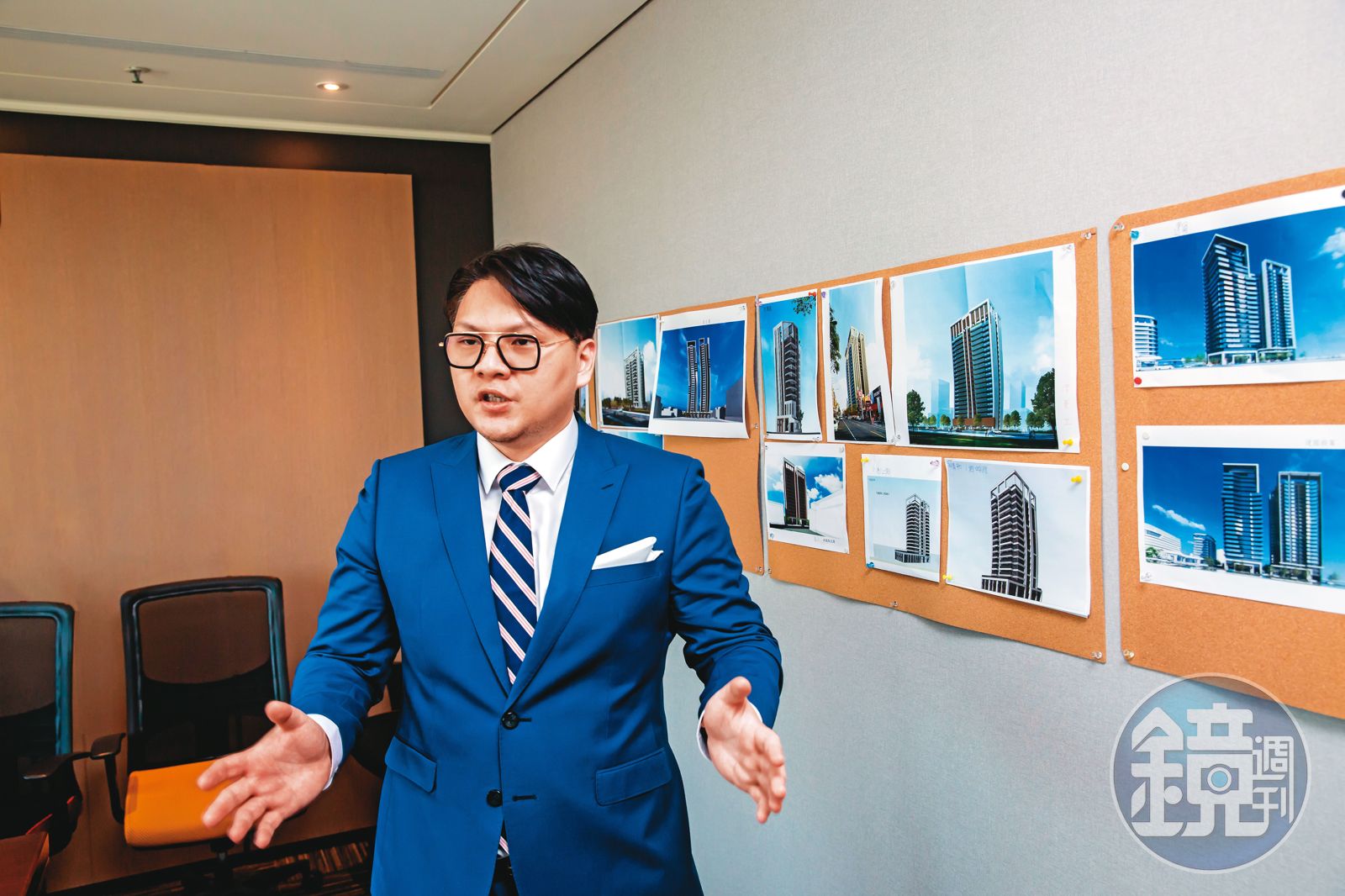 「這個建案的容積率…」5月上旬,在高雄捷運橘線信義國小站旁,一棟商辦大樓裡,一名身著藍色西裝,戴著黑框金邊眼鏡,年紀僅30多歲的男子,跟2名同事正在商討總銷數十億元的新建案規劃,在氣氛嚴肅的辦公空間裡,辦公桌上卻放著形象迥異的國民零食乖乖。