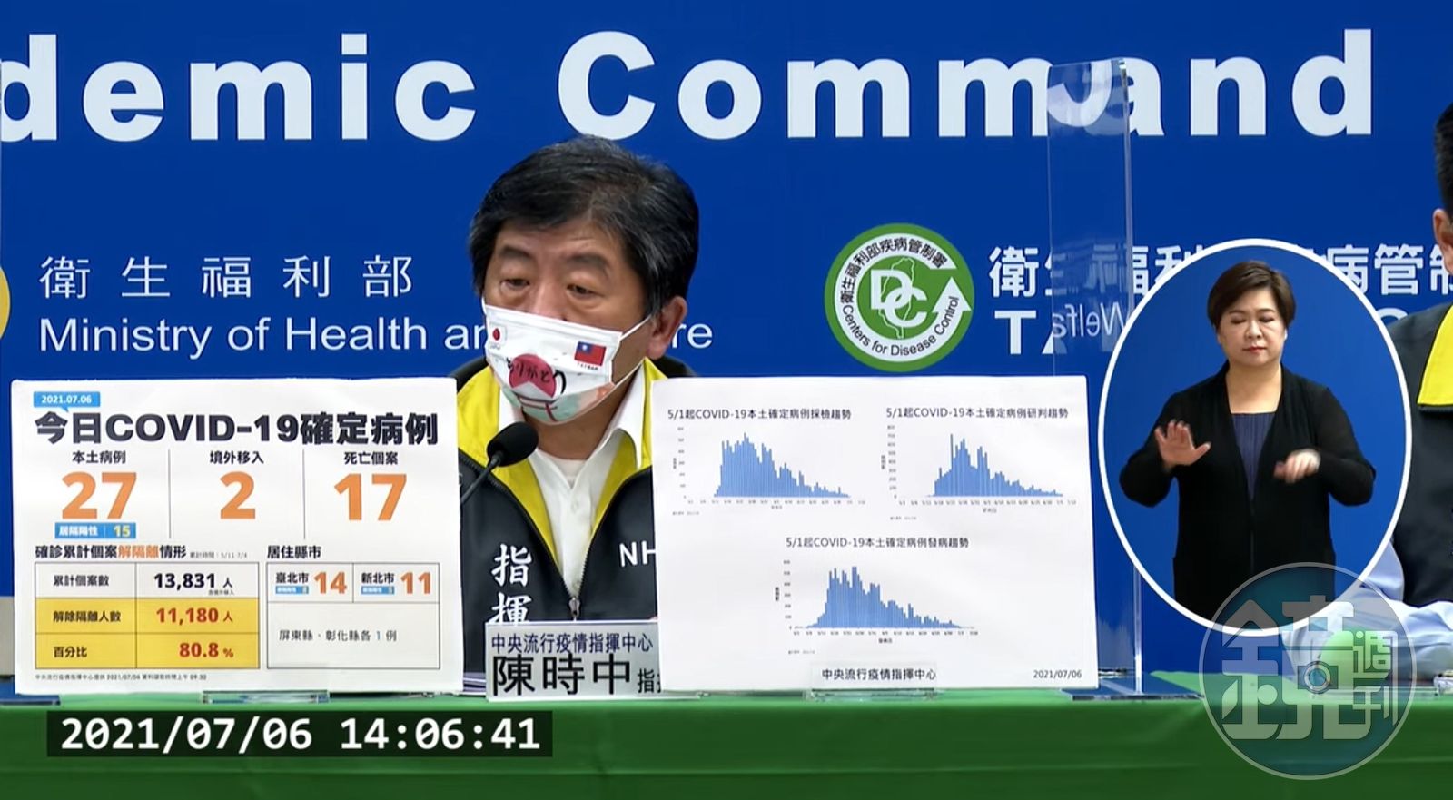 指揮中心表示,今日新增之27例本土病例(其中15例為居家隔離期間或期滿檢驗陽性者),為17例男性、10例女性,年齡介於未滿5歲至70多歲,發病日介於今年6月10日至7月5日。個案分布以台北市14例最多,其次為新北市11例、屏東縣及彰化縣各1例;其中17例為已知感染源、10例調查中,相關疫情調查持續進行中。