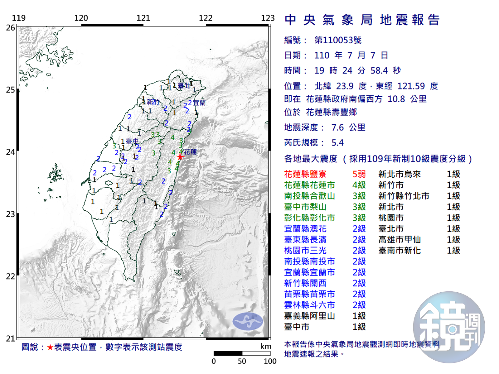 根據中央氣象局最新資料顯示,晚間19點24分發生芮氏規模5.4地震,地震深度為7.6公里,震央位於北緯23.9度,東經121.59度,即在花蓮縣政府南偏西方10.8公里,位於花蓮縣壽豐鄉。 其中最大震度位於花蓮縣地區,呈現震度5弱;南投縣、台中市、彰化縣最大震度則為3級;宜蘭縣、台東縣、桃園市、新竹縣、苗栗縣、雲林縣最大震度2級;嘉義縣、新北市、新竹市、台北市、高雄市及台南市最大震度則為1級。