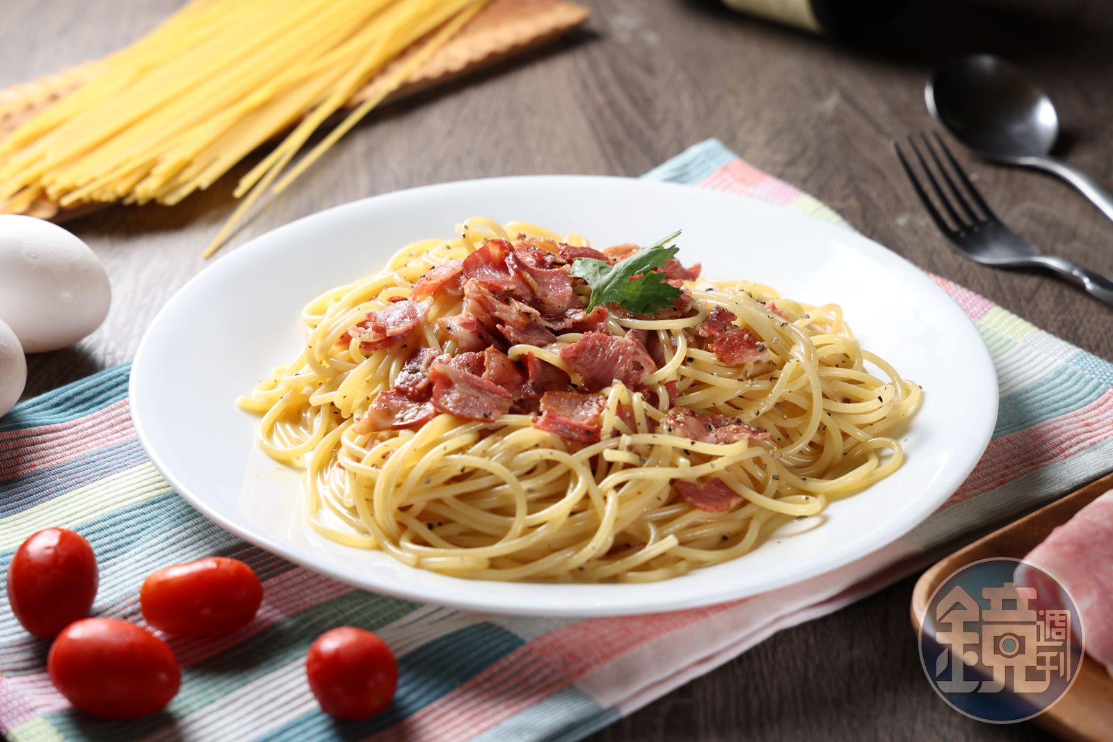 「義式培根蛋汁麵(Carbonara)」可以一次消滅大量的培根,這道菜是把義大利麵煮熟後,倒入混有培根碎(用火腿也行)的蛋汁快速拌炒,將熟未熟的蛋黃乳化後會形成濃郁醬汁巴在麵條上,間雜黑胡椒與培根的香氣,簡單又涮嘴。