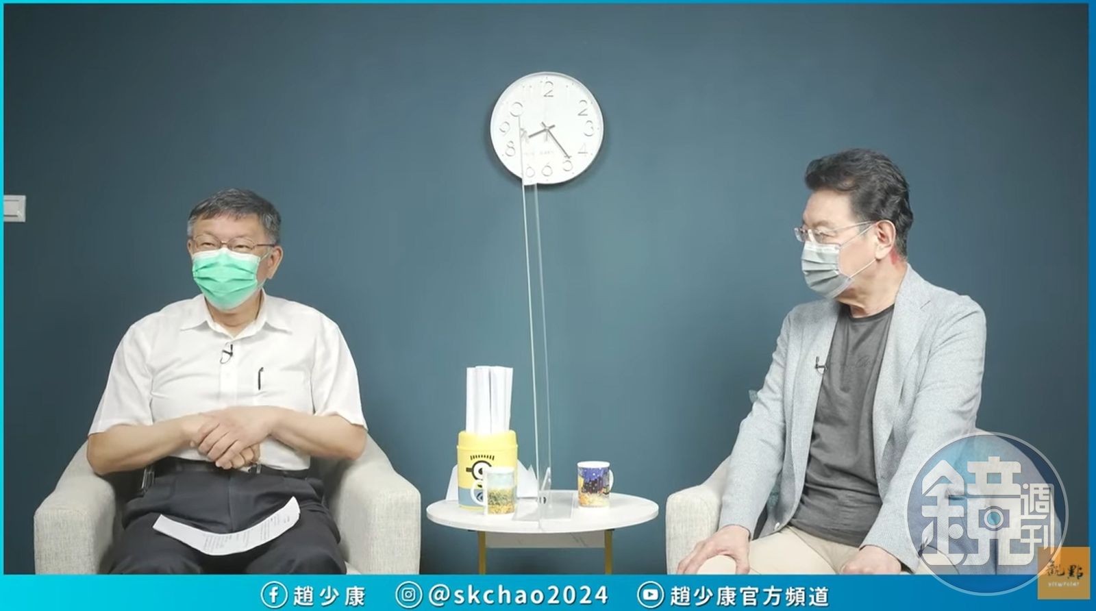 趙少康聲稱,總統蔡英文不會用賴清德、陳建仁,陳建仁是因前陣子打高端疫苗公信力,認為蔡英文要下來接手指揮官一職,柯則表示「不會啦」。柯文哲直言,理論上指揮官怎麼會給衛福部長從頭做到尾,防疫還牽涉到紓困、採購疫苗,因此「一直覺得這指揮體系很奇怪,沒道理。」趙少康在訪談中頻頻砲打陳時中,並指若是在古代將軍守城造成軍民傷亡「早該推出去斬首了還能守嗎!」