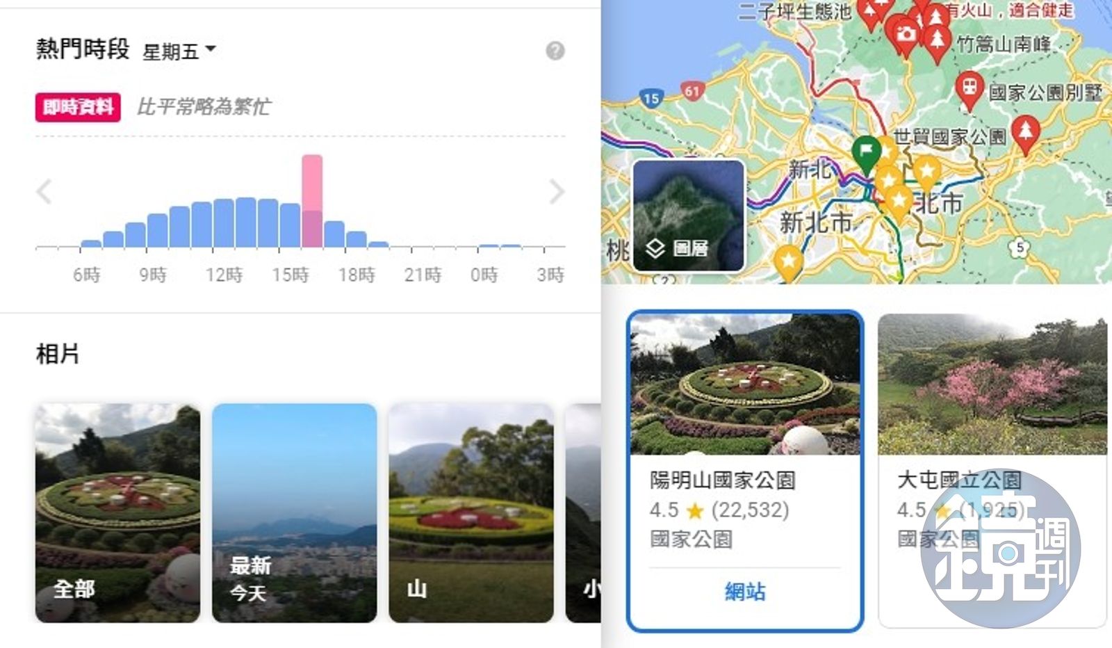 出門前可利用「Google Map」,從地圖上各個地標,之到自動跳出「熱門時段」,會顯示商家或地點目前的繁忙狀況,該數據會根據過往經驗人潮的平均值,具有參考意義,若是出門有特定地點,可使用此功能。