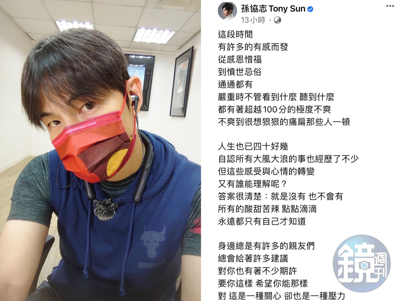 平時說話總是客客氣氣的孫協志坦言,「這段時間有許多的有感而發,從感恩惜福到憤世忌俗通通都有,嚴重時不管看到什麼、聽到什麼,都有著超越100分的極度不爽,不爽到很想狠狠的痛扁那些人一頓。」自認活到40幾歲,也算是見過不少大風大浪,遇到問題「酸甜苦辣、點點滴滴永遠都只有自己才知道。」但身邊的親朋好友總愛出意見,讓他感到身心俱疲,「這是一種關心,卻也是一種壓力。」