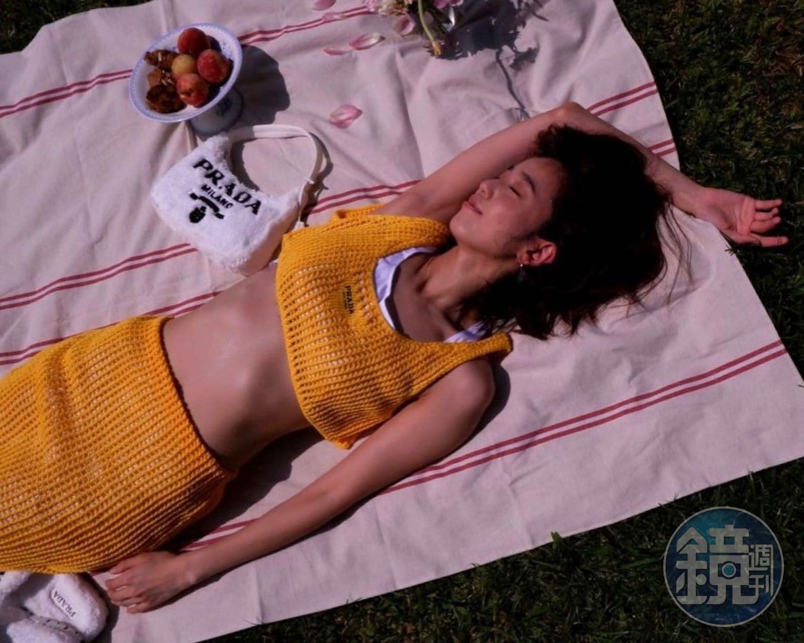 陳庭妮穿上PRADA OUTDOOR系列,躺在自家頂樓,幻想已經一秒至花蓮度假。(翻攝自陳庭妮IG)發布時間:2021.07.10 17:06 臺北時間