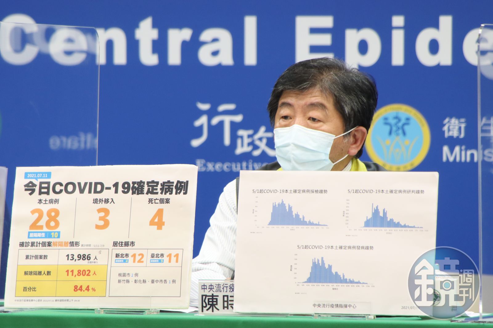 指揮中心指出,近期確診個案解隔離情形,5月11日至7月9日累計公布13,986位確診個案中,已有11,802人解除隔離,解隔離人數達確診人數84.4%。