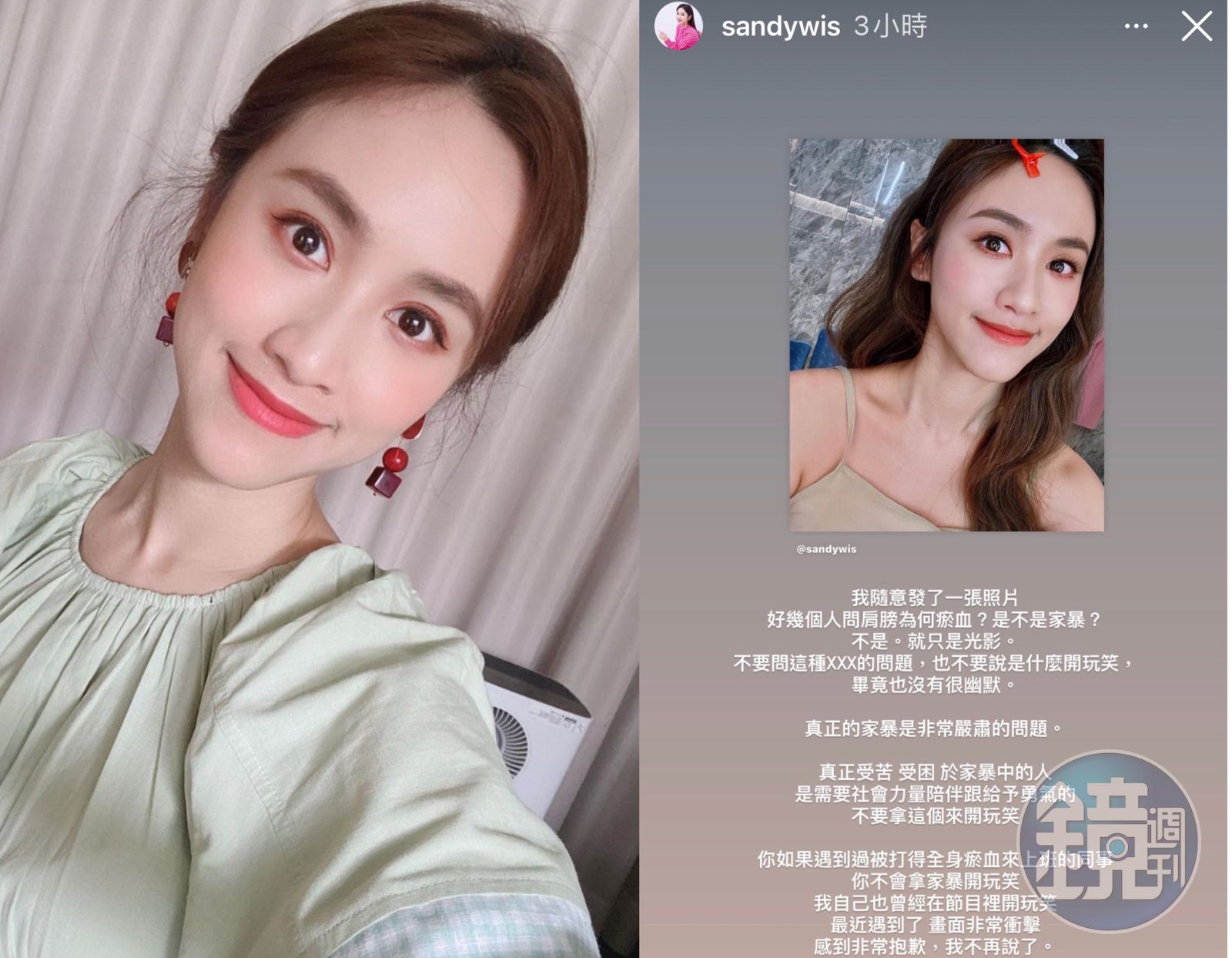 到底是什麼事情,讓Sandy如此嚴肅看待呢?原來是日前她隨意貼了一張自拍照片,照片中她的左肩胛出現疑似「烏青」的斑塊,有網友開玩笑稱「被家暴嗎?」讓她趕緊澄清「只是光影」,強烈指責網友「不要問這種XXX的問題,也不要說是什麼開玩笑,畢竟也沒有很幽默。」