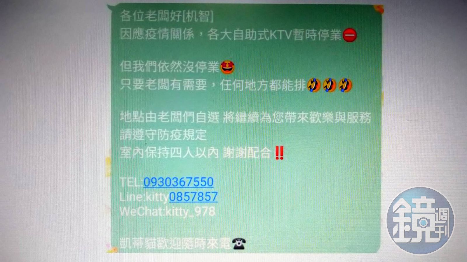 日前有讀者向本刊投訴,指彰化地區有家「凱蒂貓」經紀公司,原本將小姐送往彰化縣各自助式KTV或酒店、理K、私人招待所等處陪侍,但疫情期間這些場所都停業,於是轉往地下化發展,將小姐送到民宅陪酒,還提醒顧客「只要室內保持4人以內」就不違法,至於是否會超過4人,沒被抓到誰也不曉得。