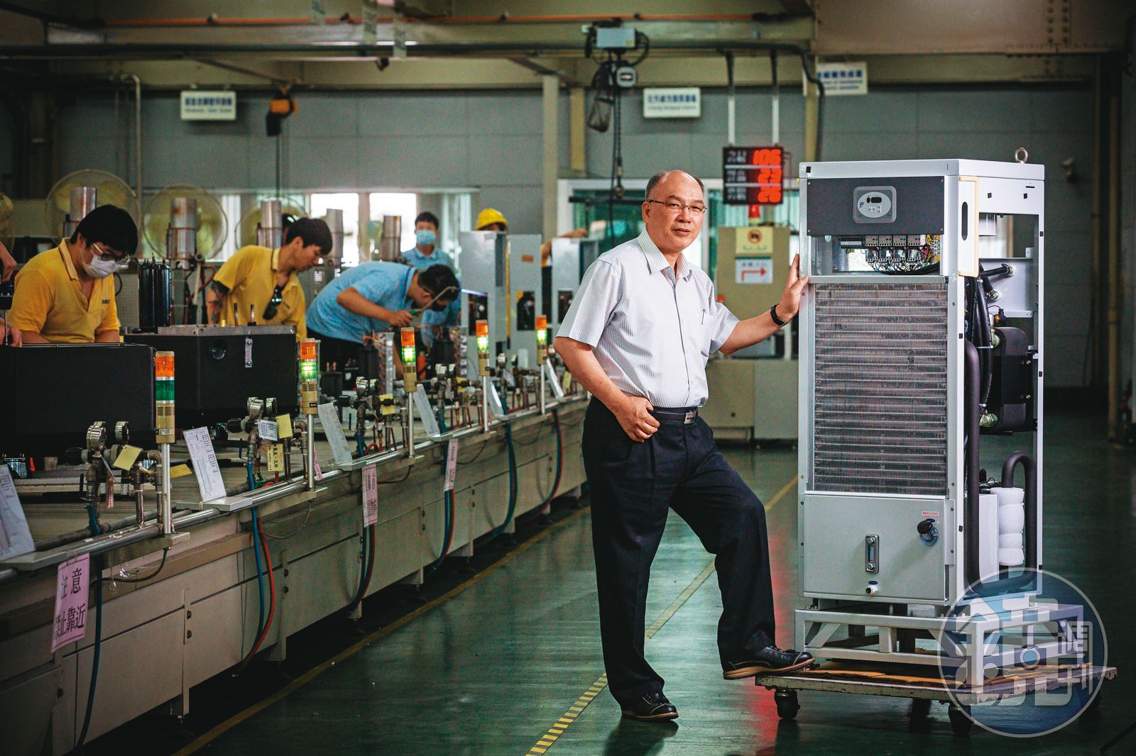 連續生產線上,十多人分工作業,焊接主體、組上散熱片、測試冷媒管,慢慢拼出形似水冷扇的機器,這是用來降低工具機溫度的冷卻機,相較一般商用冷氣,對溫控精準度要求極為嚴苛,尤其是運用在航太、手機相關工業的機器,溫度稍有差池,產品就會整個報銷。