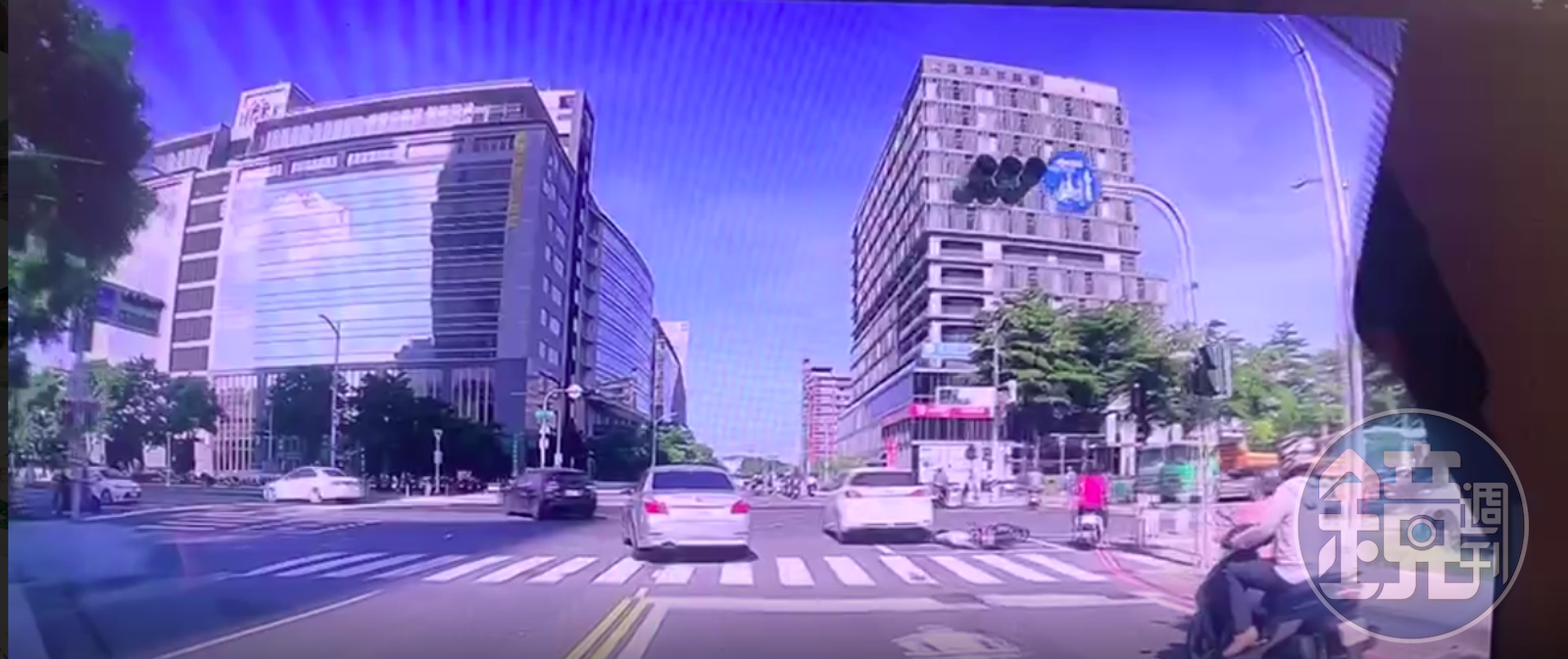 只見畫面中,丁允恭駕駛的白色Lexus轎車行駛於機慢車道,抵達路口時欲向左切入快車道,卻與劉姓女機車騎士擦撞,導致劉女摔車;丁得知女騎士摔倒後,也立即停下車查看。